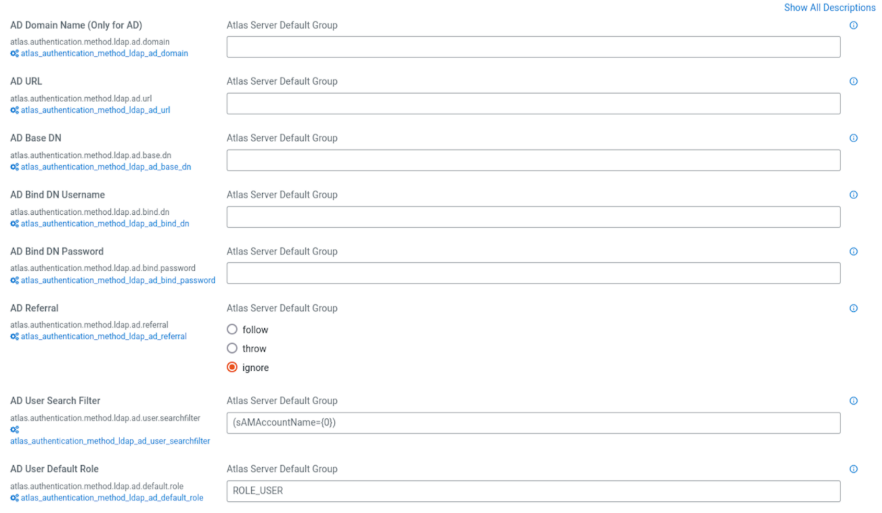 3. Selecting “ad”, prompts you to use appropriate active directory values to complete the Atlas authentication type.
