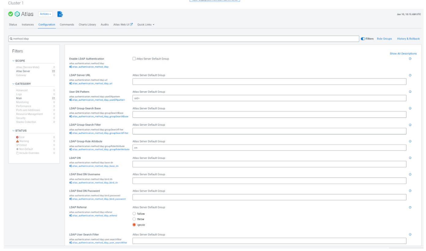 1. In your Cloudera Manager instance > Select Clusters > Configuration tab > On the search bar, use the key: atlas.authentication.method.