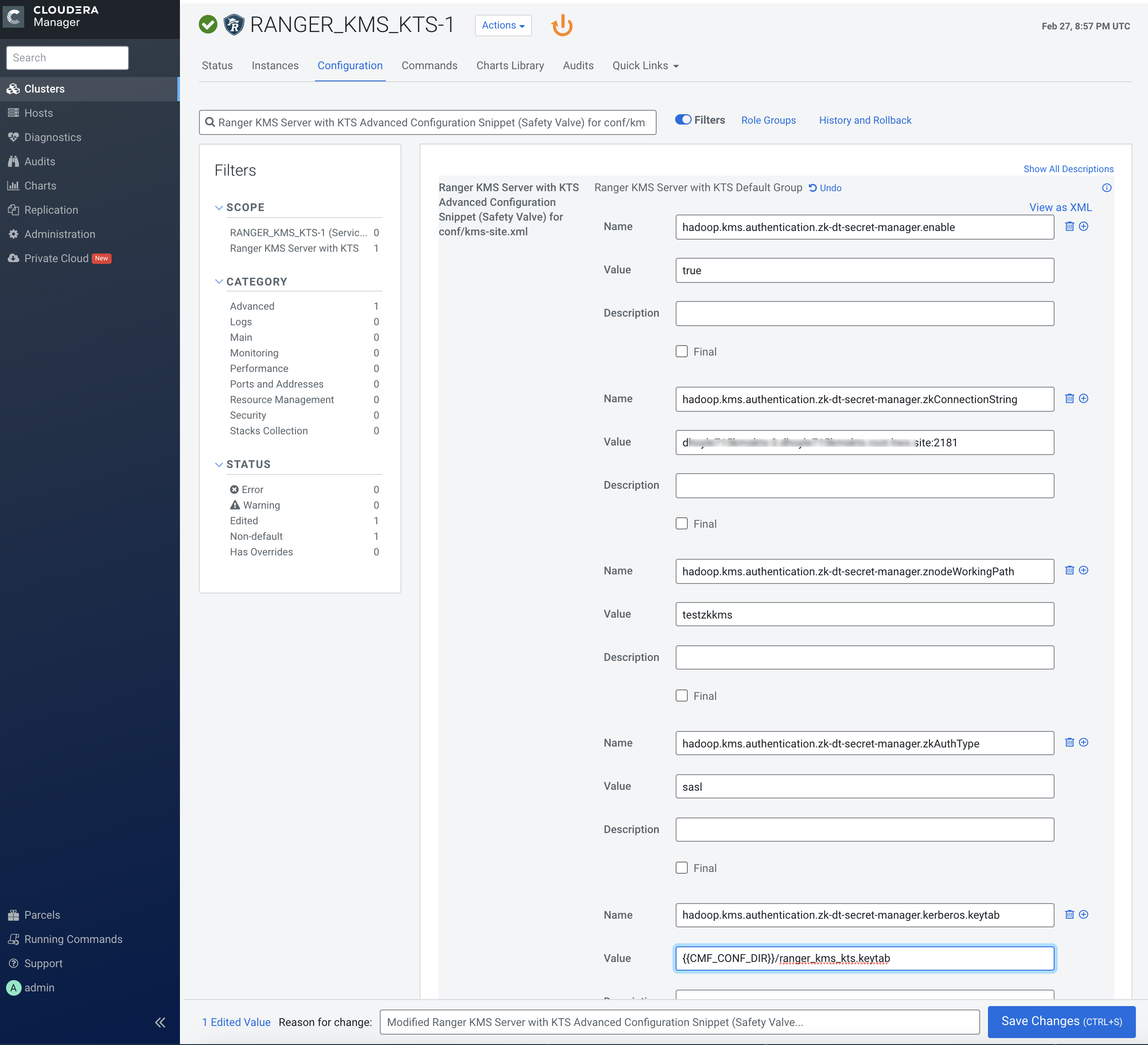 5. In the Search field, enter Hadoop KMS Authentication Signer Secret Provider Zookeeper Auth Type and in the property select the sasl option.