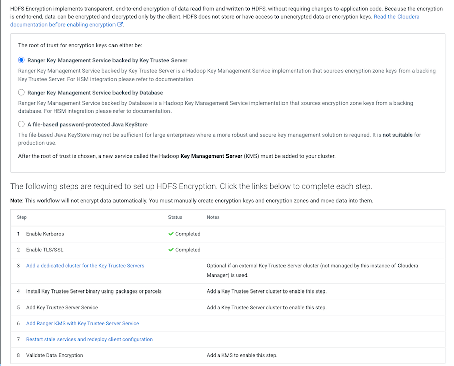 5. To set up HDFS Encryption, follow the instructions as described below for each of the Set up HDFS Data At Rest Encryption Wizard's steps.