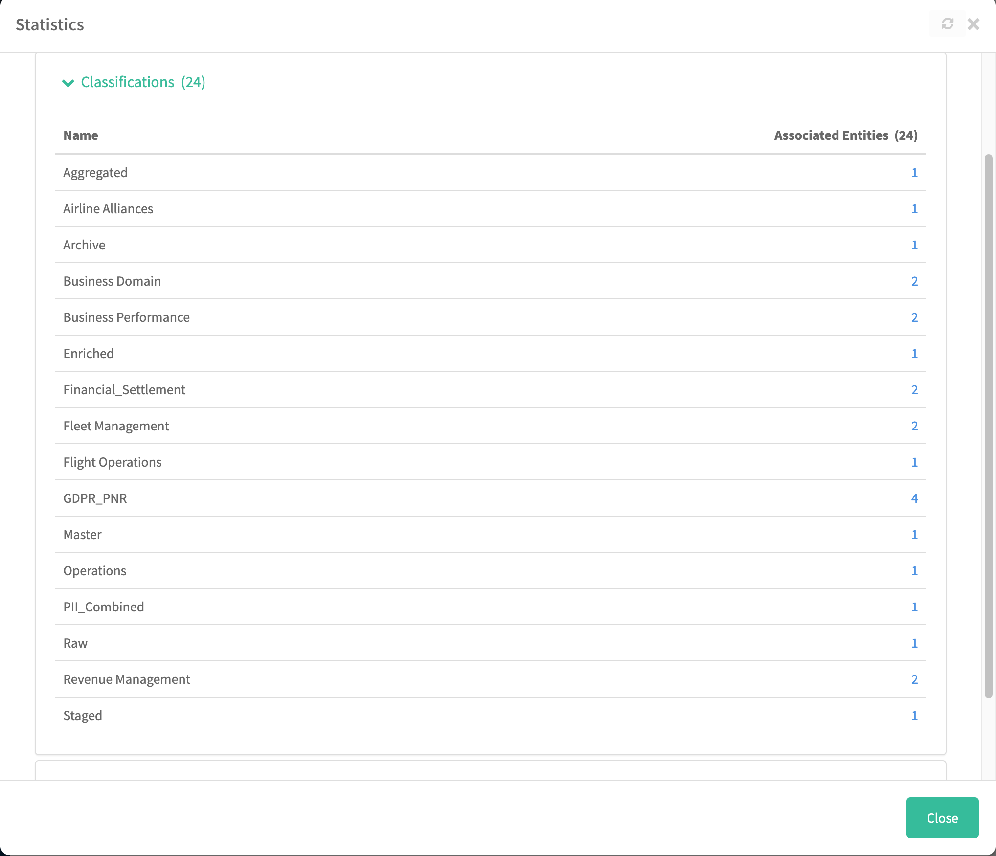 - In the Statistics page, the Count label is changed to Associated Entities to avoid confusion. This number shows the number of entities marked with that classification.