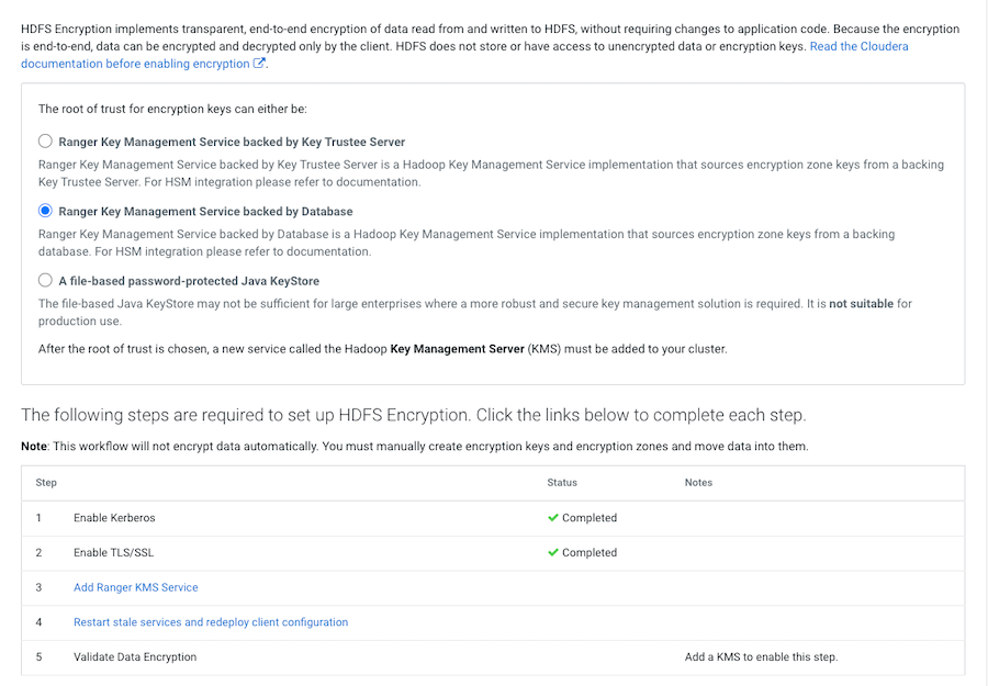The following image shows the Set up HDFS Data At Rest Encryption page. When you select your encryption keys root of trust option, a list of tasks that you must do to enable encryption to-and-from HDFS is displayed.