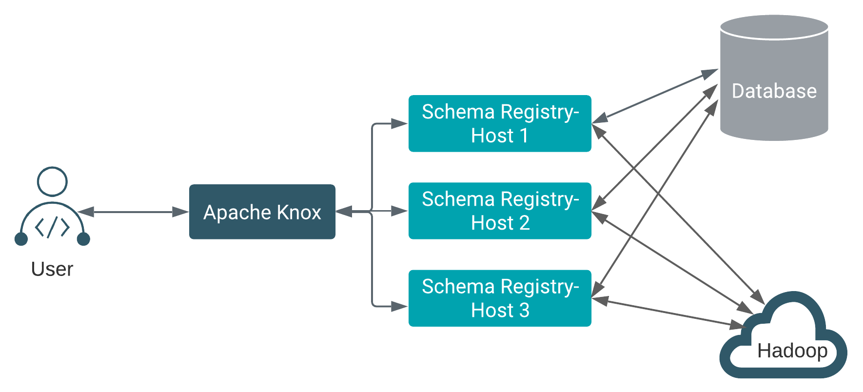 The lack of server-side caching creates a minor performance impact. However, it enables Schema Registry to be stateless and be distributed over multiple hosts. All hosts use the same database. This enables a client to insert a schema on host A and query the same schema on host B.