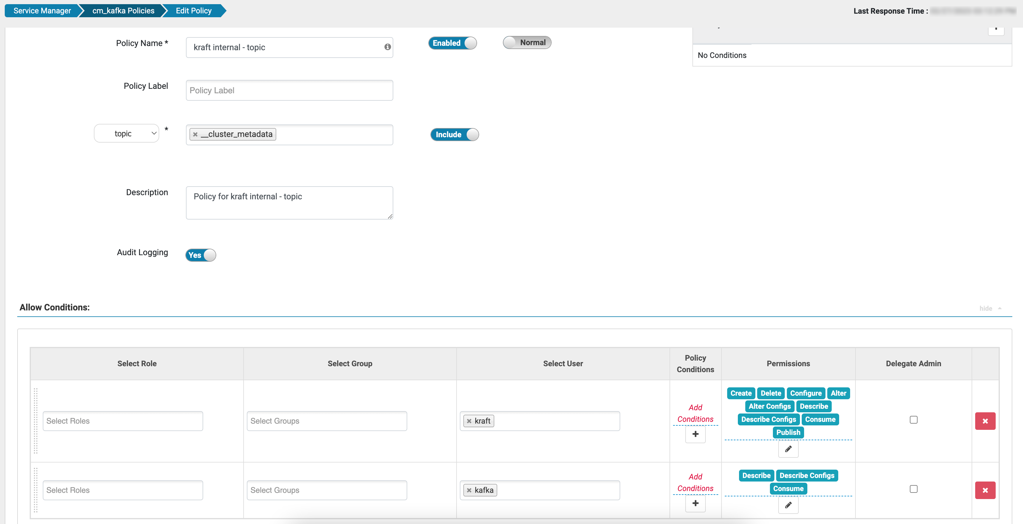 In addition, the kraft user is added to all default Kafka policies that grant