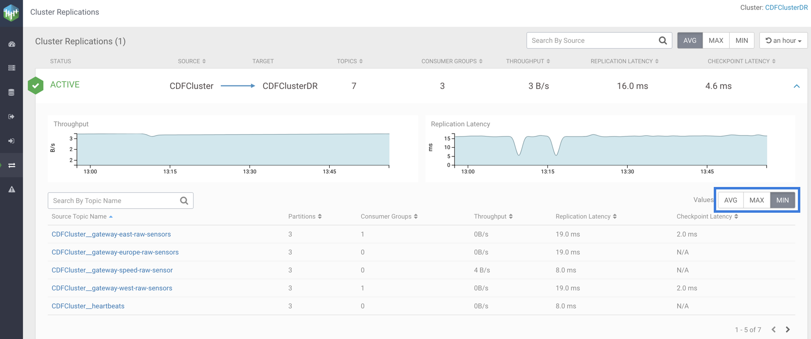 Click the AVG, MAX, or MIN buttons, as shown in the following image, to fetch average, maximum, or minimum values of throughput, replication latency, and checkpoint latency for topics.
