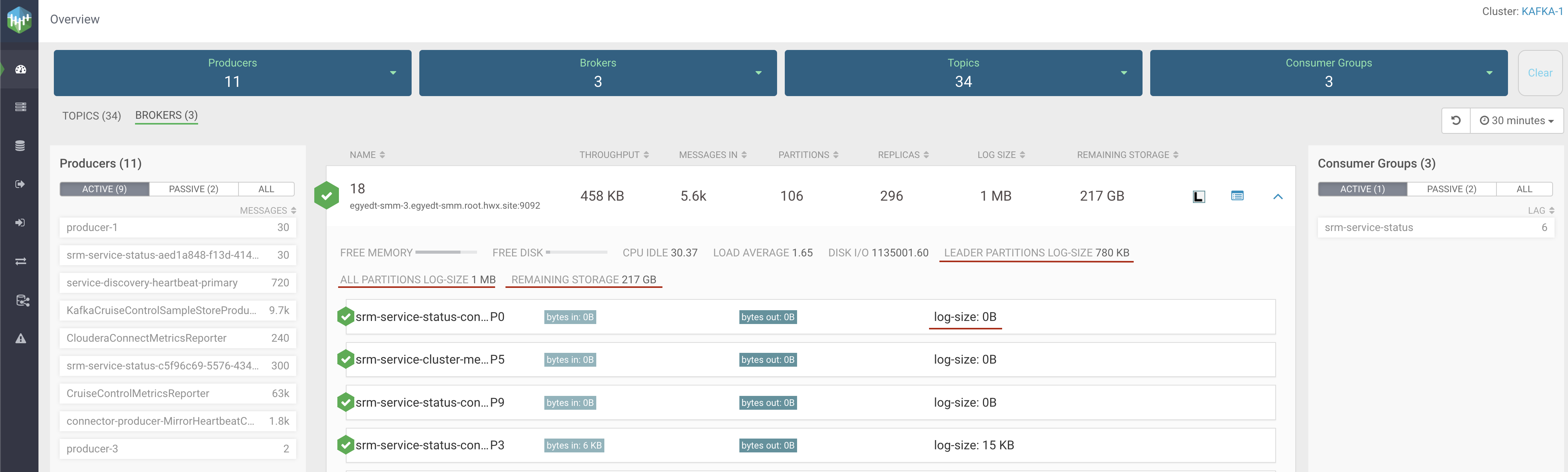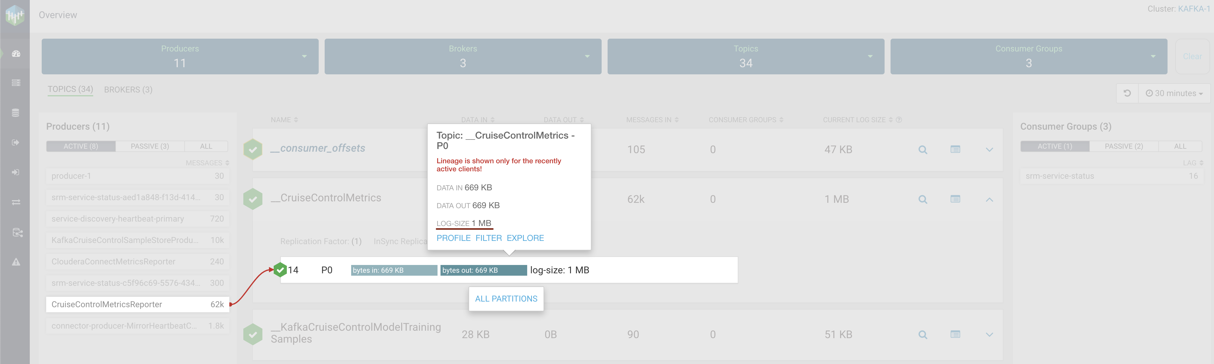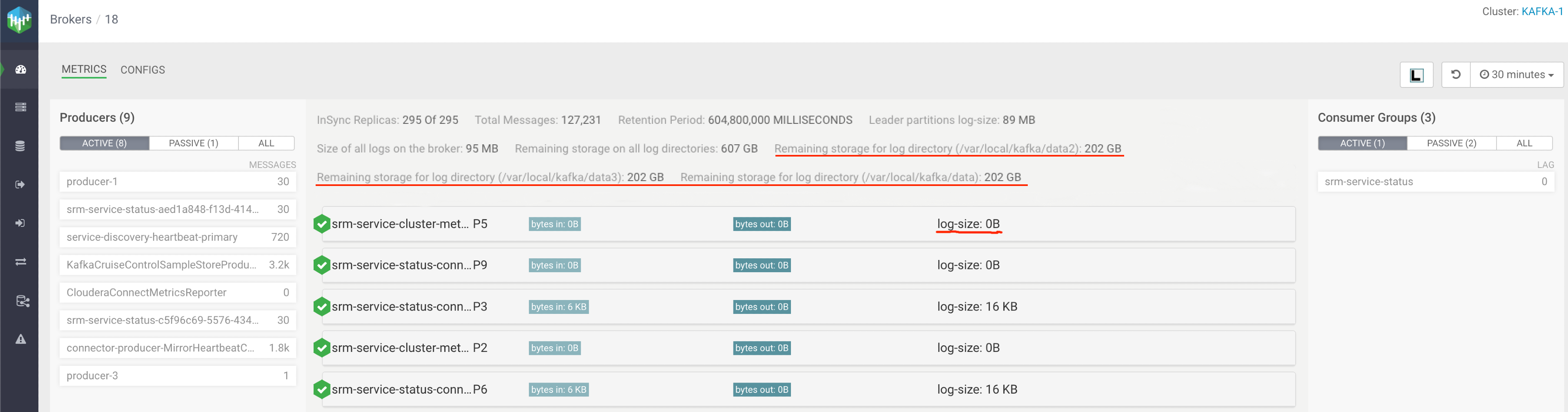 broker are displayed. The log-size information per partition is available. Furthermore, the