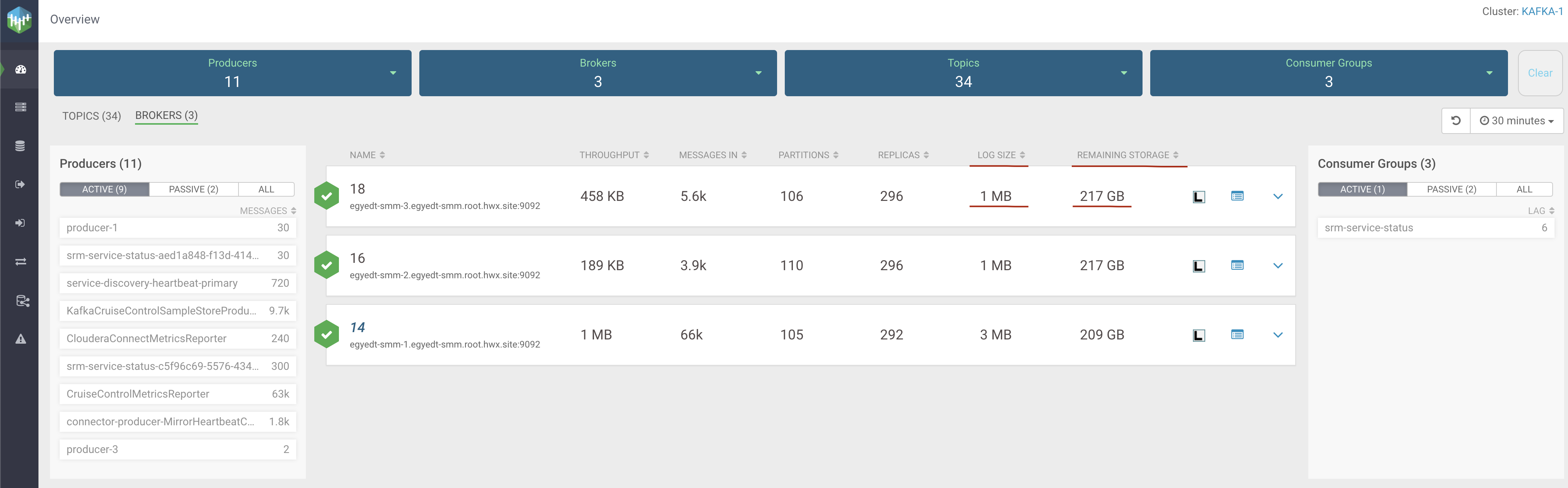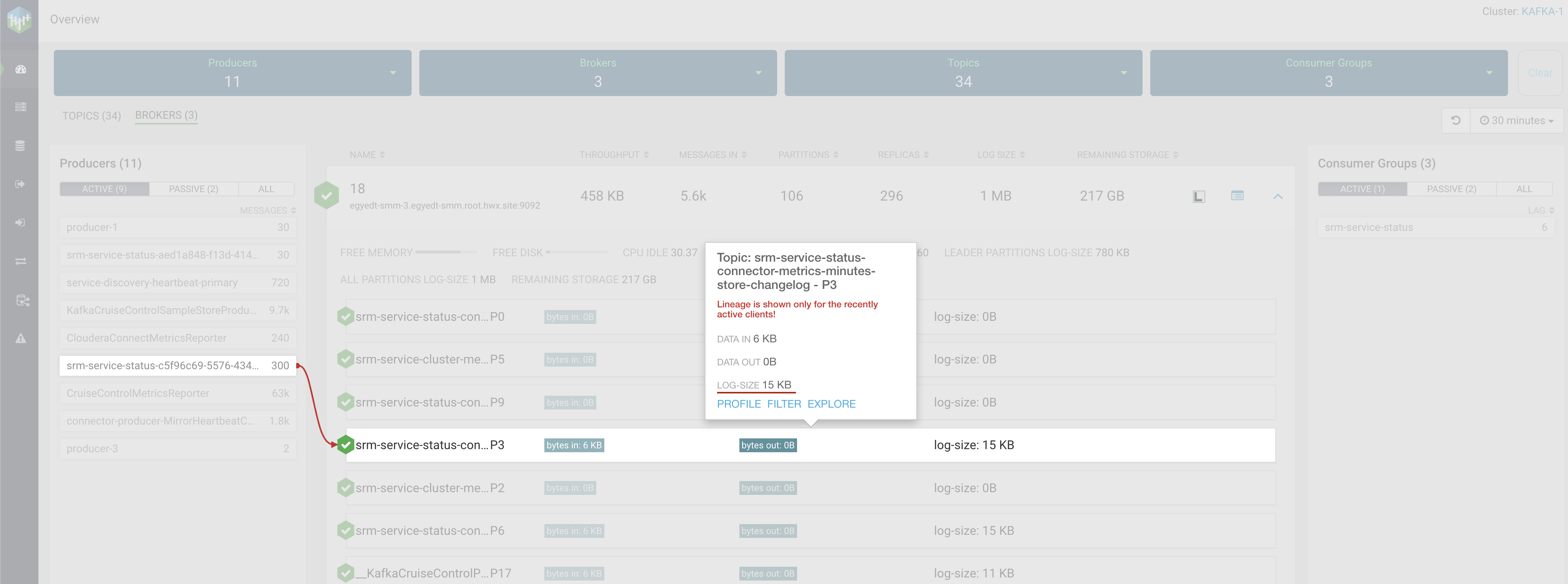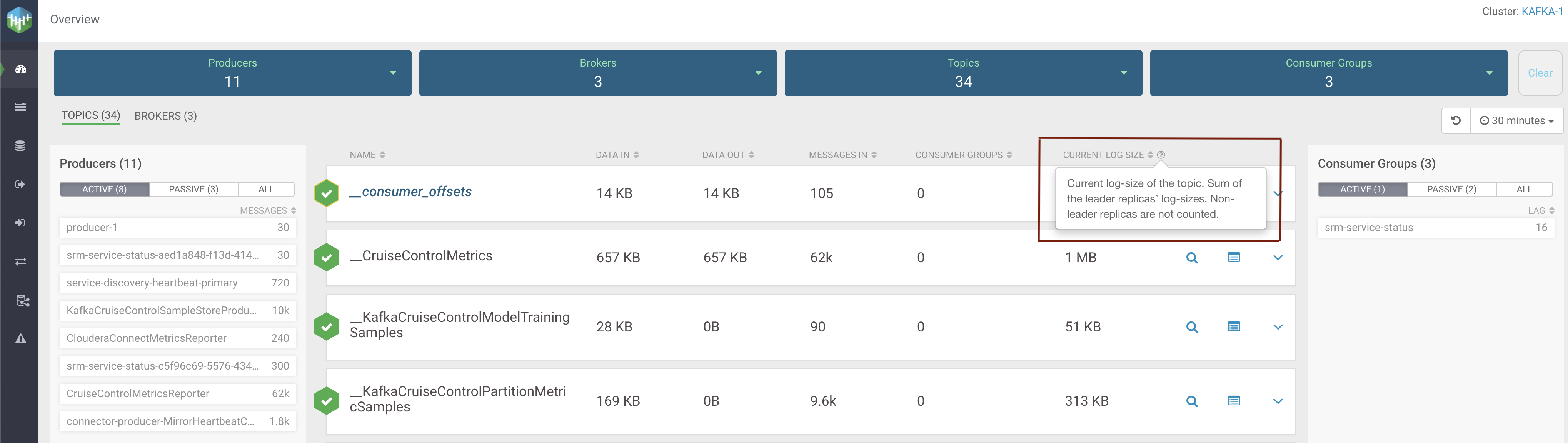 broker are displayed. The log-size information per partition is available. Furthermore, the