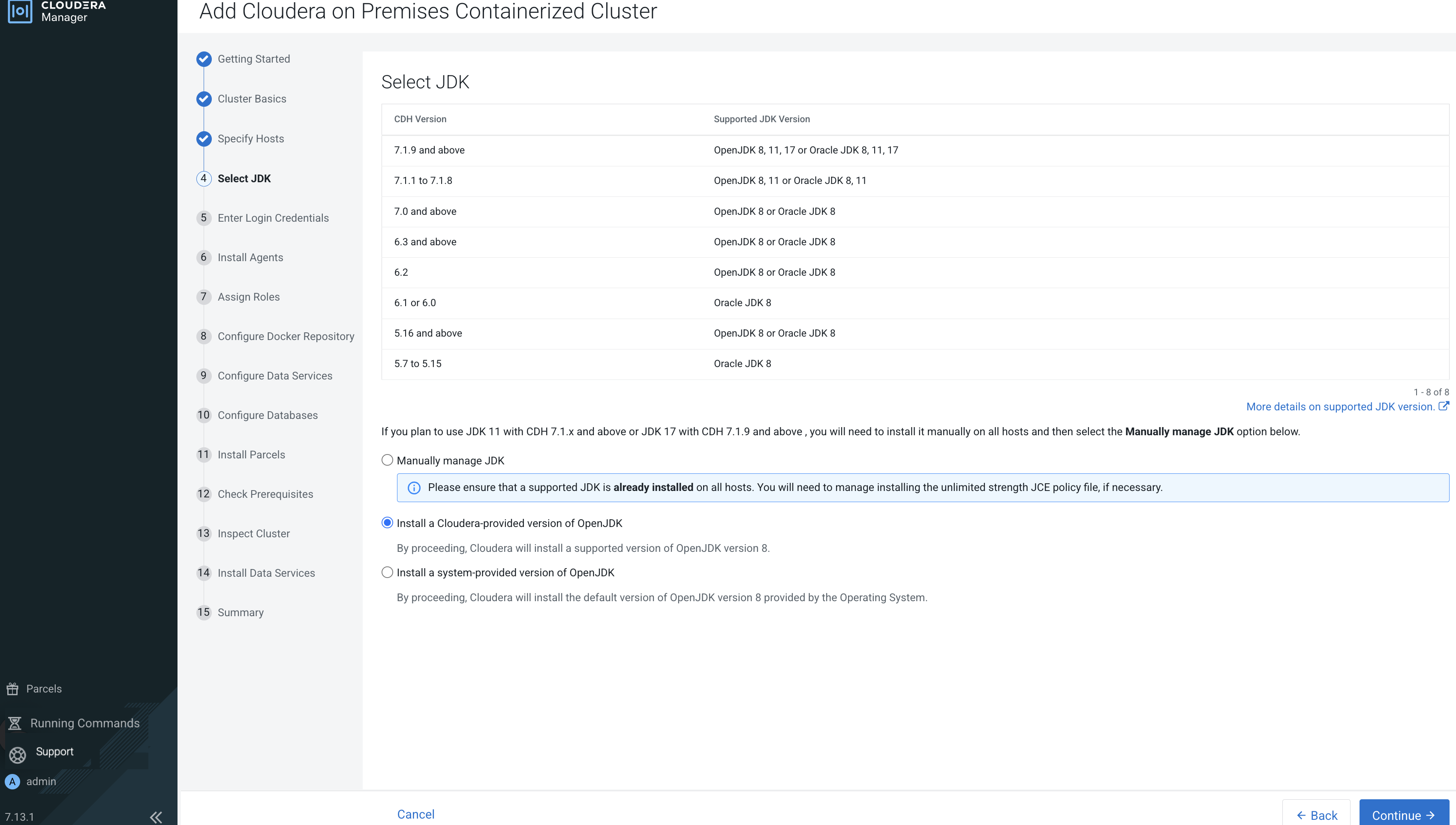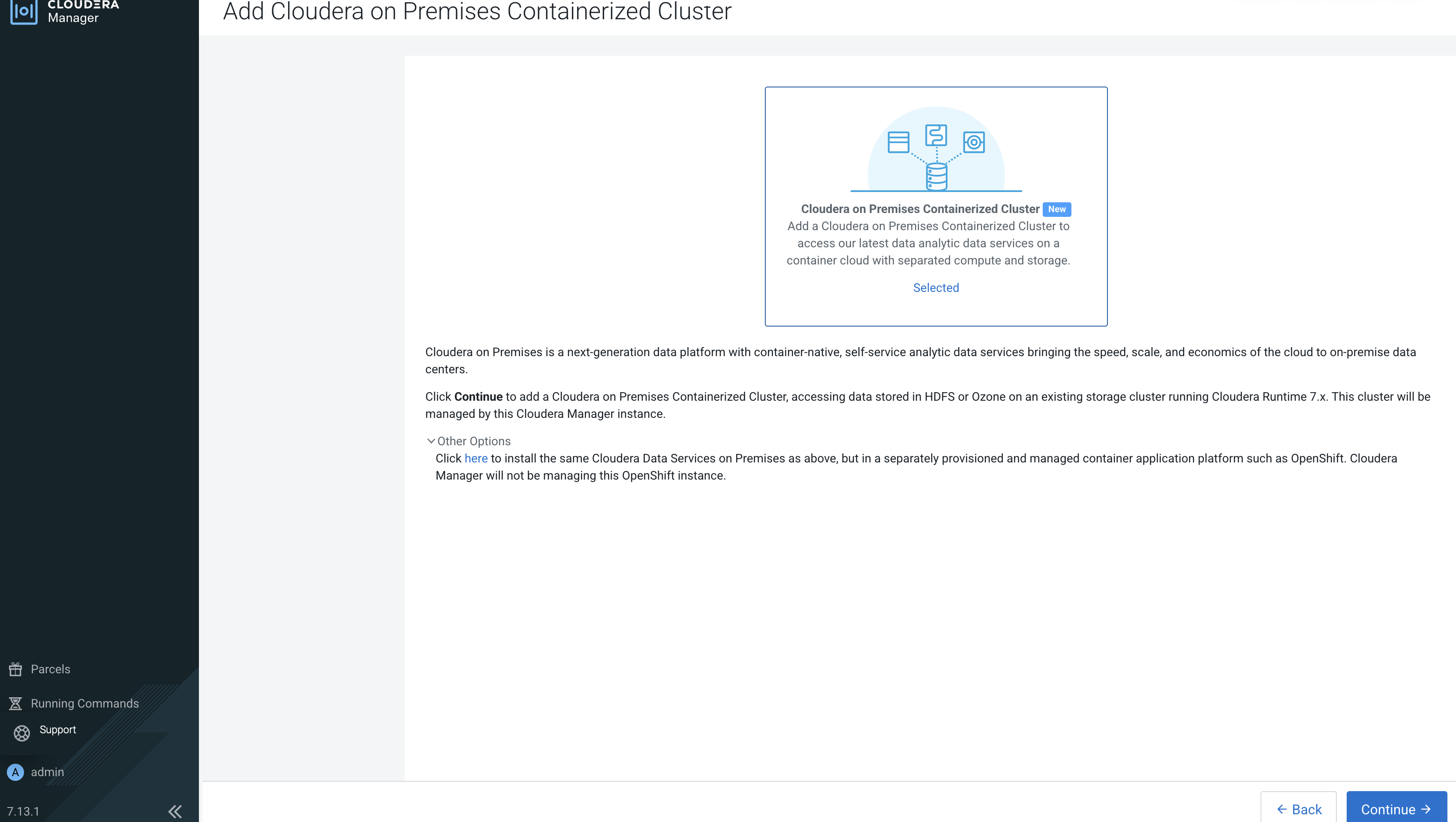 cert.pemandkey.pemfiles from the Cloudera Manager server host to the Cloudera Embedded Container Service Management Console host. - Click Open Cloudera on premises to launch your Cloudera Data Services on premises instance.