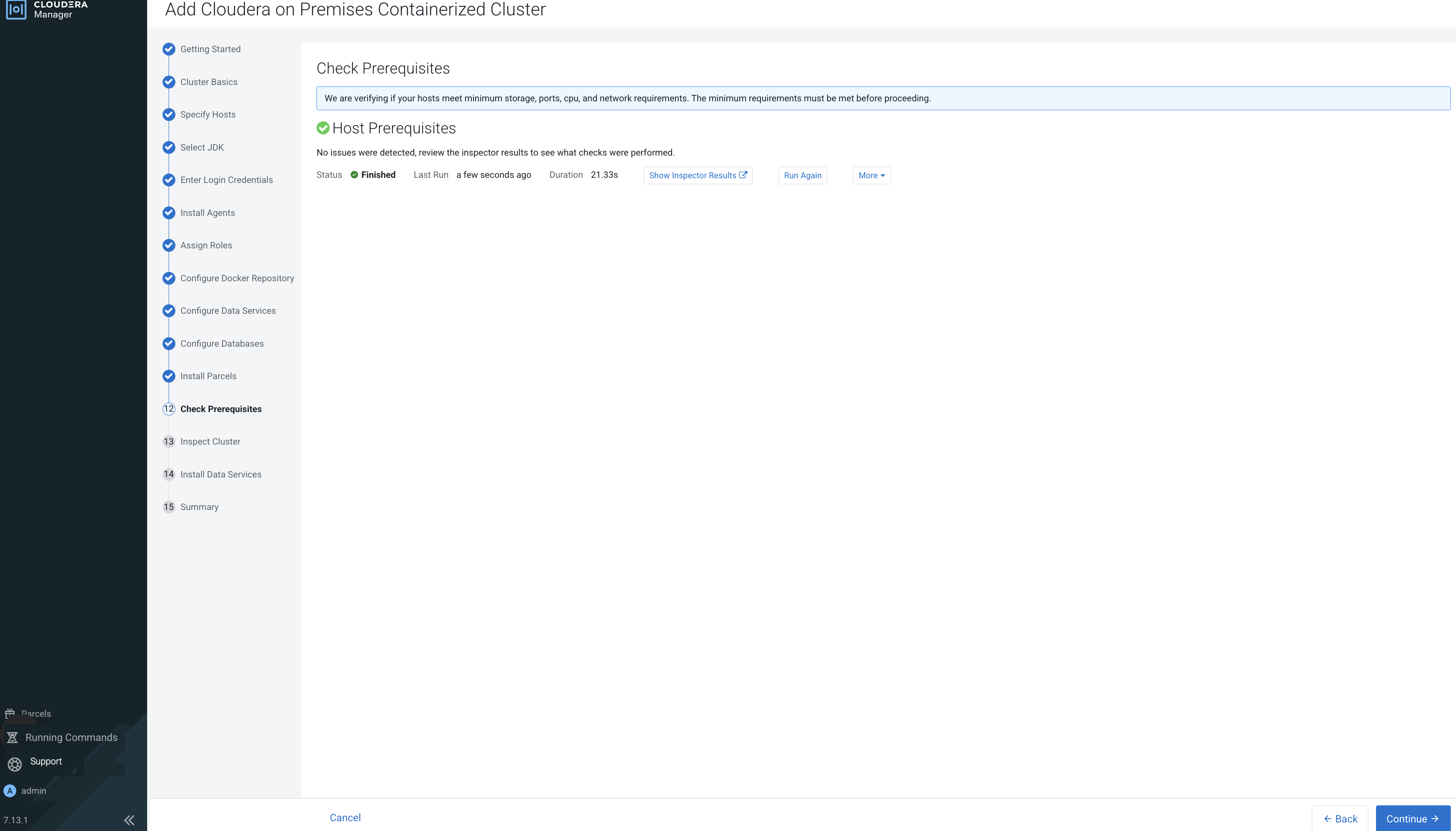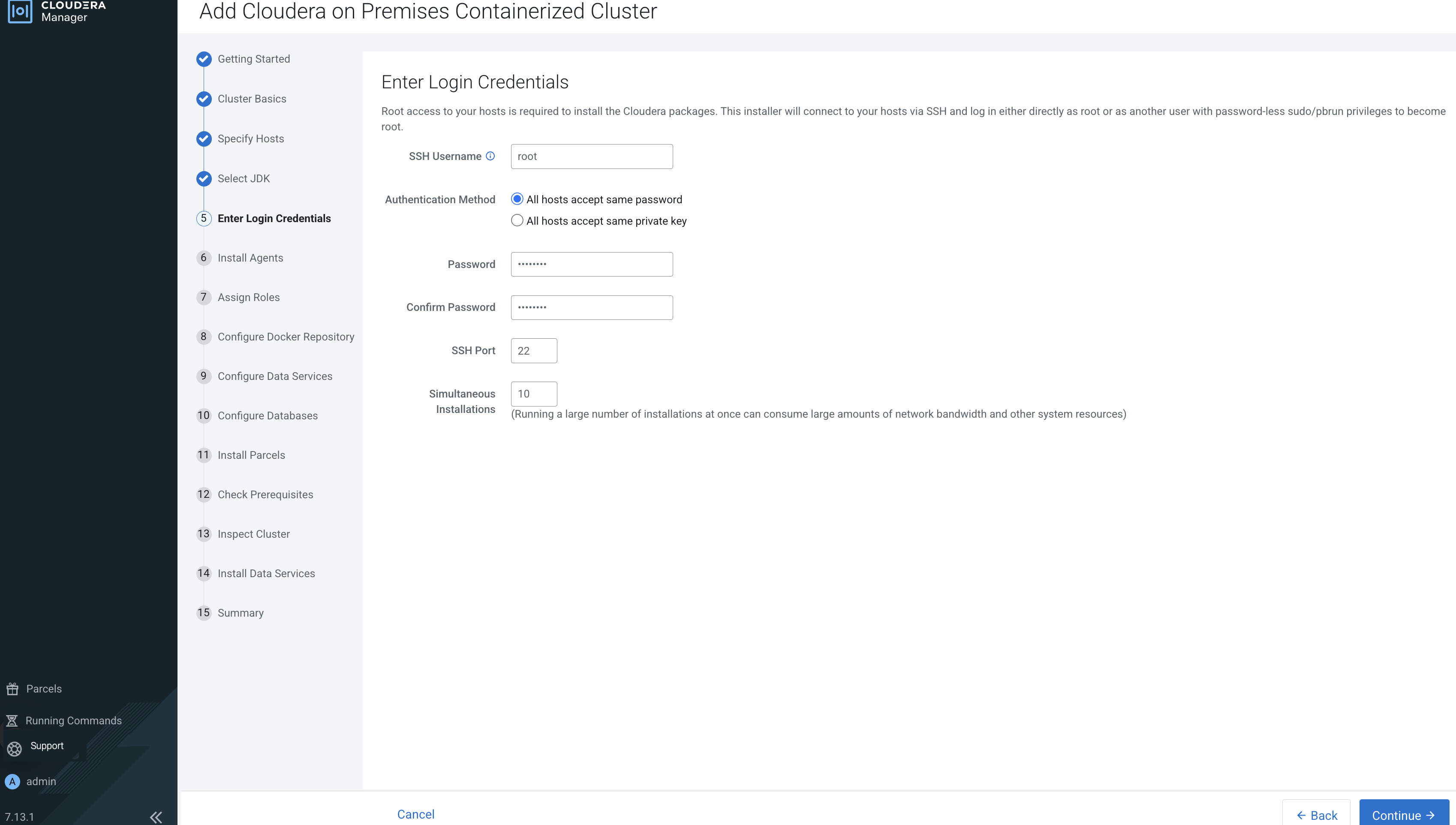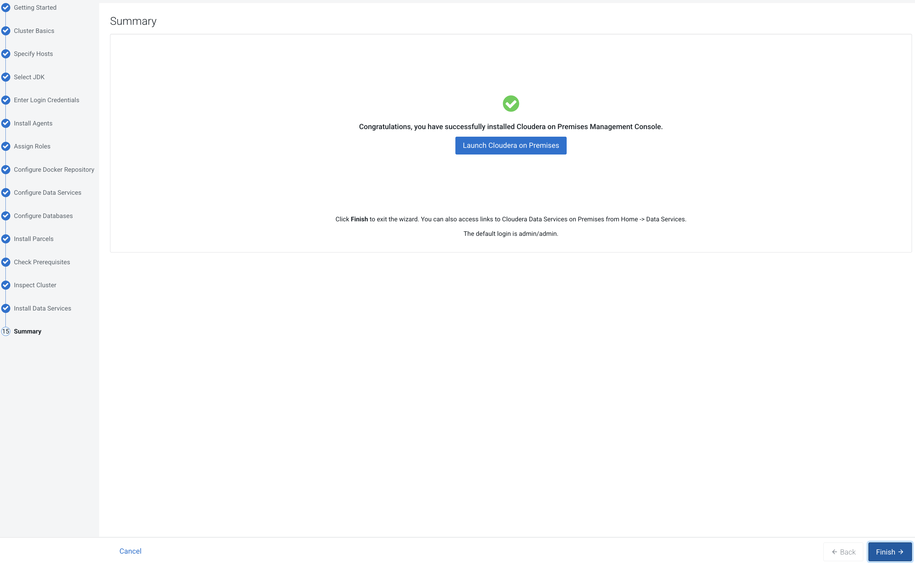 - On the Welcome to Cloudera on premises page, click Reset Admin Password to change the Local Administrator Account password.
