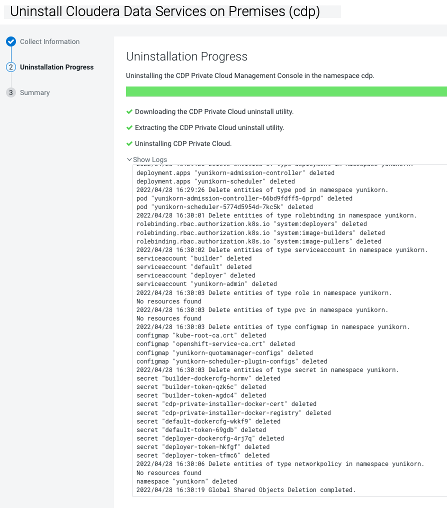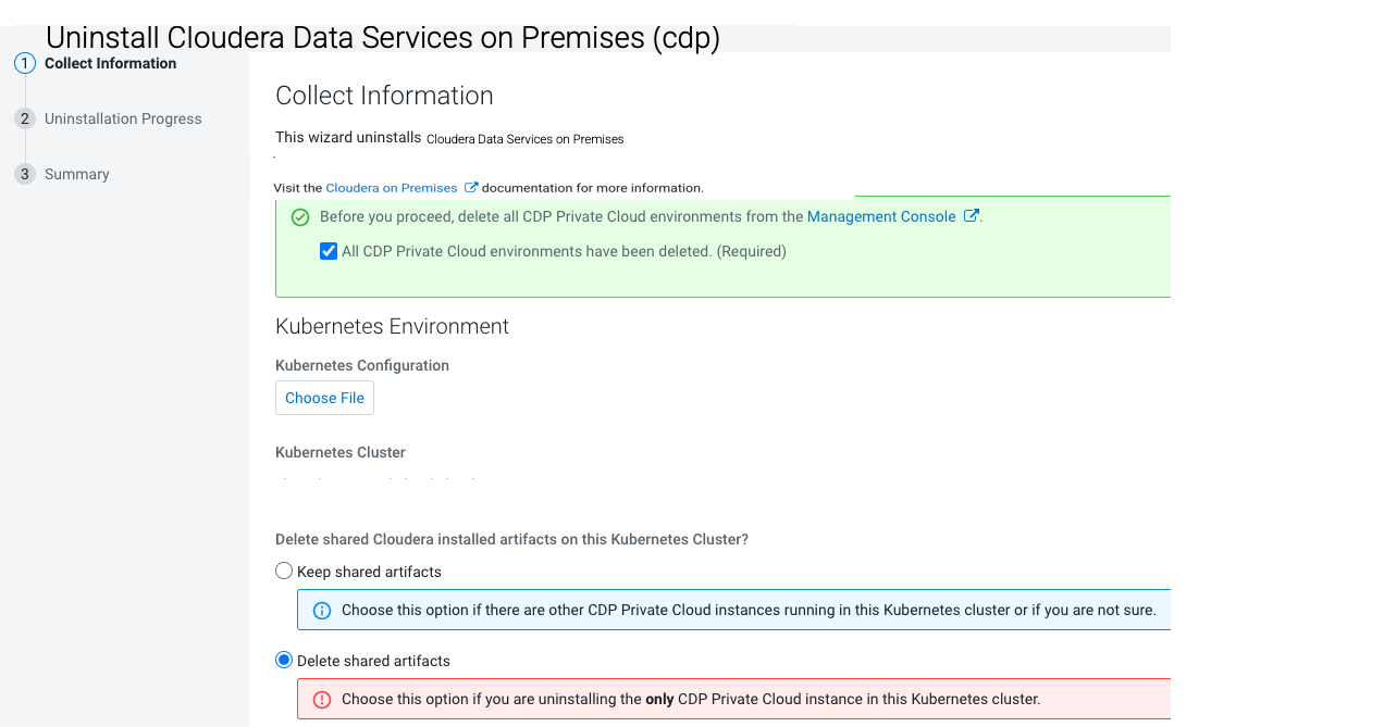 Select Keep shared artifacts if you have other Cloudera Data Services on premises instances running in your
