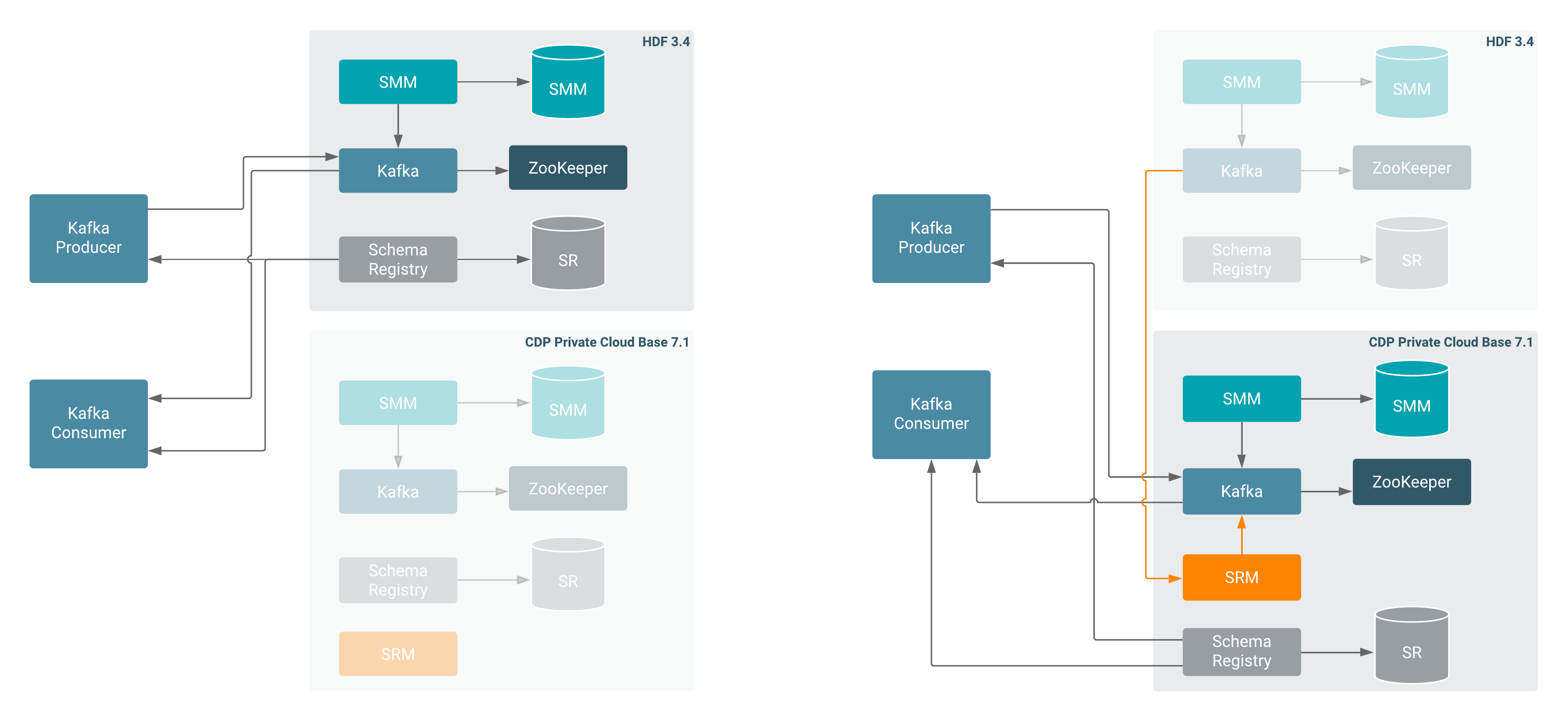In this scenario data is migrated from a HDF 3.4 cluster with Streams Messaging Manager, Kafka, and Schema Registry to a Cloudera Private Cloud Base 7.1 cluster with Streams Messaging Manager, Kafka, Schema Registry, and Streams Replication Manager.