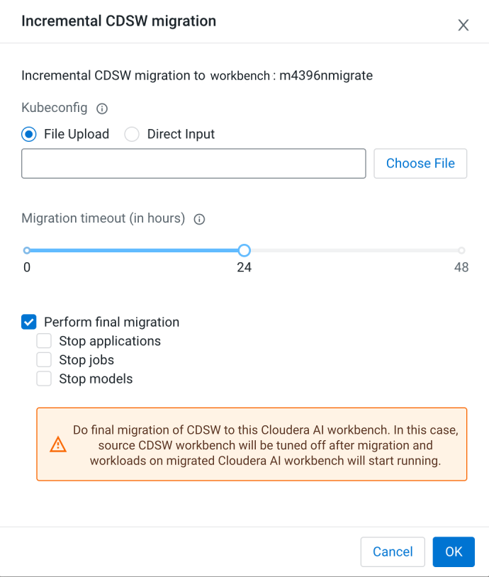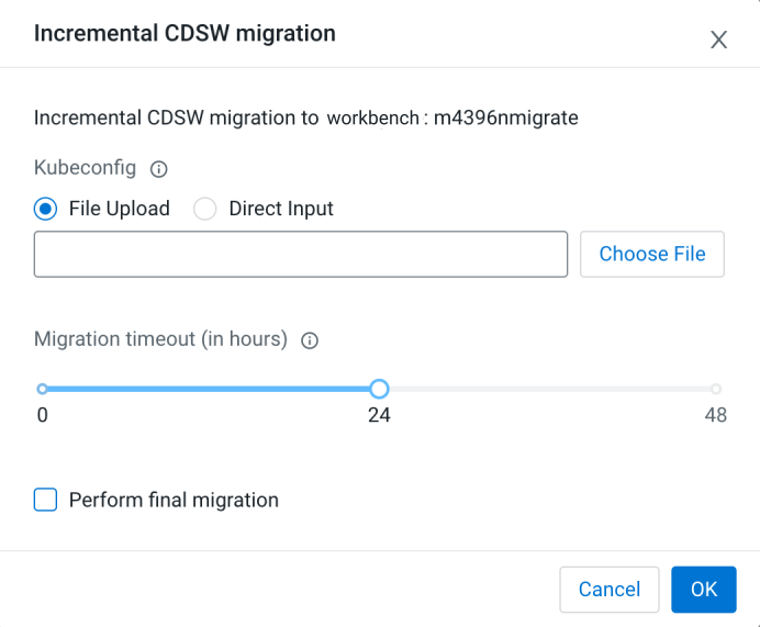 - This is an optional parameter. If no change to the CDSW Kubeconfig occurs, then you do not need to select this option. The system will use the Kubeconfig that was provided during the initial migration. This option can be helpful if CDSW is restarted during the migration and changes to the CDSW Kubeconfig occur.
