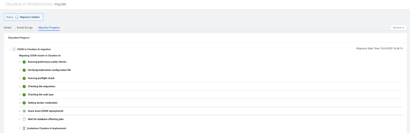 After the Cloudera AI installation, the migration readiness checks and the migration follow automatically. Status indicators show the progress of the installation and migration. During the migration, you can access the CDSW cluster. The migration process does not stop CDSW pods. The Cloudera AI Workbench is stopped.