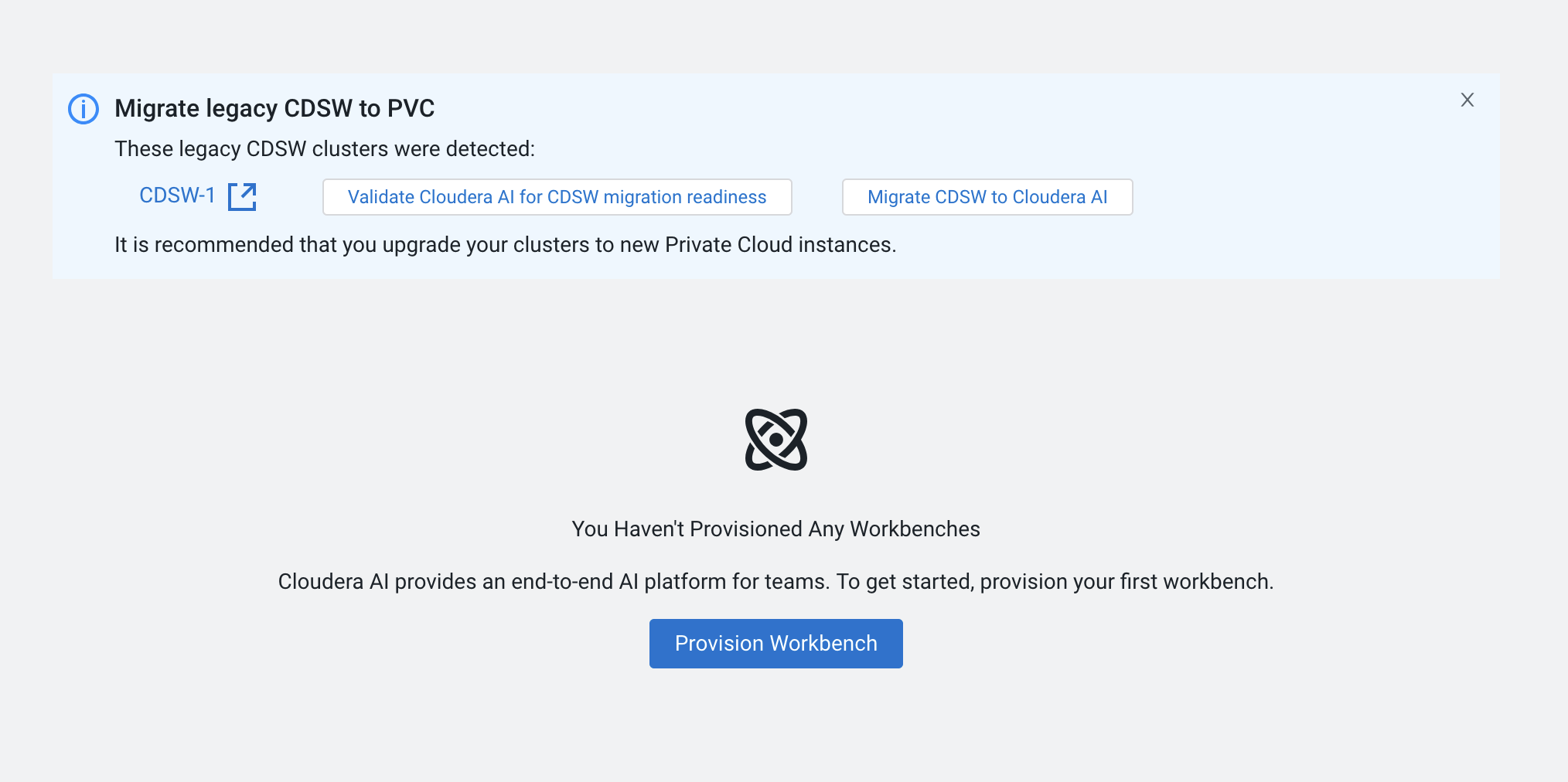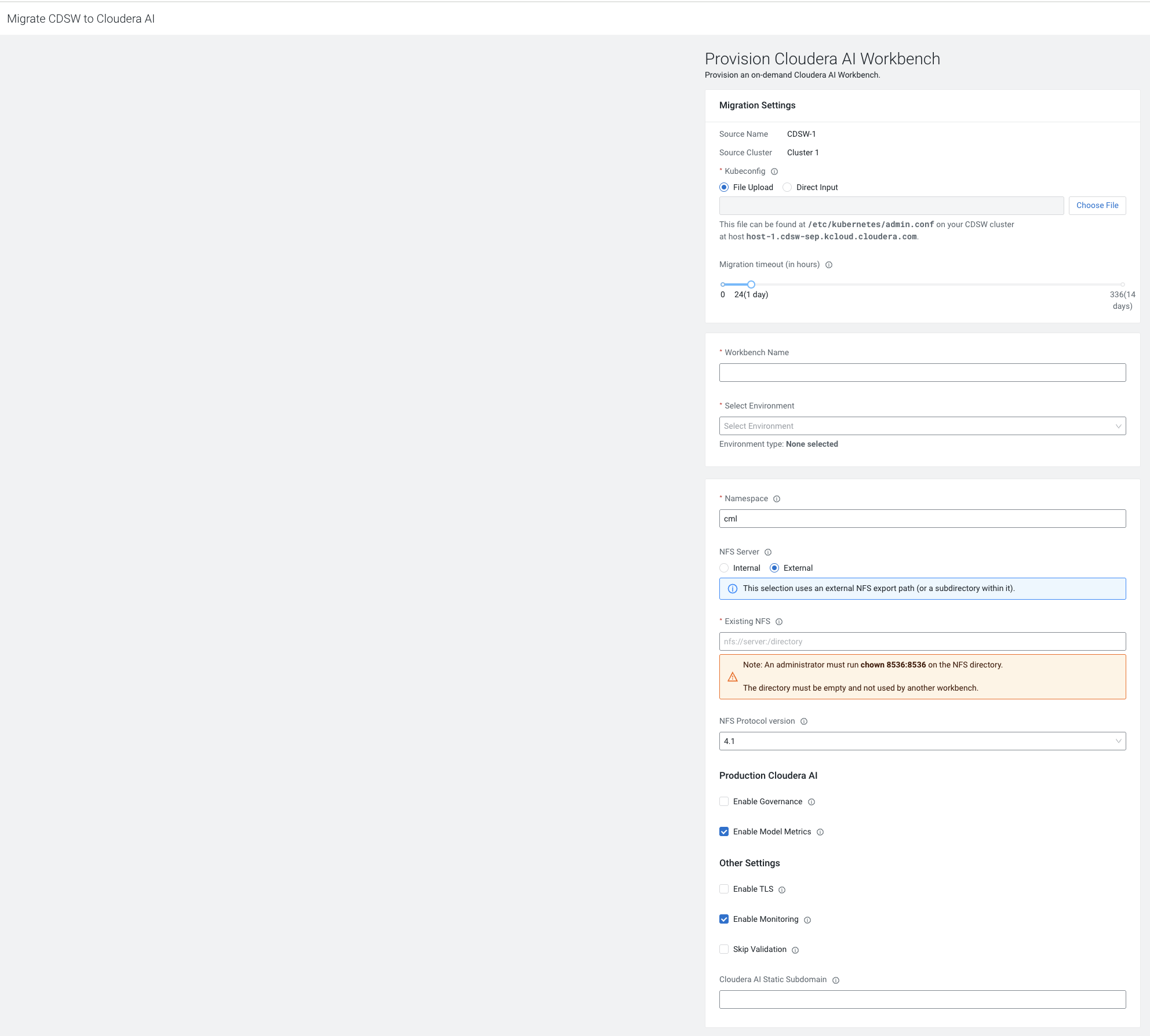 - Migrate CDSW to Cloudera AI - The Migration tool provides a Cloudera AI Workbench provision window with additional options.