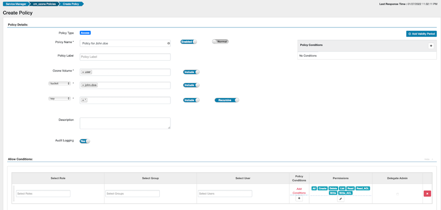 > ozone sh bucket create -k xxx_key /user/john.doe