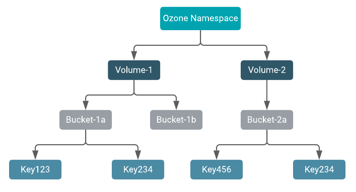 The Ozone namespace includes the following conceptual entities: volumes, keys, and buckets. Each key is part of a bucket, which, in turn, belongs to a volume. Only an administrator can create volumes. Depending on their requirements, regular users can create buckets in volumes. Ozone stores data as keys inside these buckets.