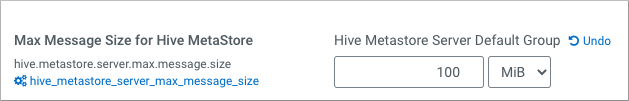 3. Set hive.metastore.server.max.message.size to the recommended value: 10% of the value of your Java heap size for Hive Metastore Server in bytes, but no more than 21478364. Recommended value: 214748364
