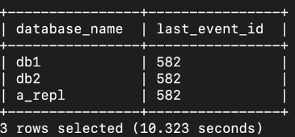 On the CDP cluster, run the following query to get the last event id for each database replication.