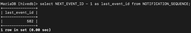 select NEXT_EVENT_ID - 1 as last_event_id from NOTIFICATION_SEQUENCE;Output looks something like this:
