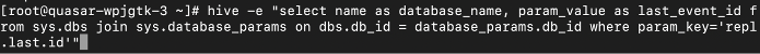 select name as database_name, param_value as last_event_id from sys.dbs join sys.database_params on dbs.db_id = database_params.db_id where param_key='repl.last.id'For example, as root you invoke Hive with the Hive 3-supported option -e, and enclose the query exactly as shown above in quotation marks.Output looks something like this: