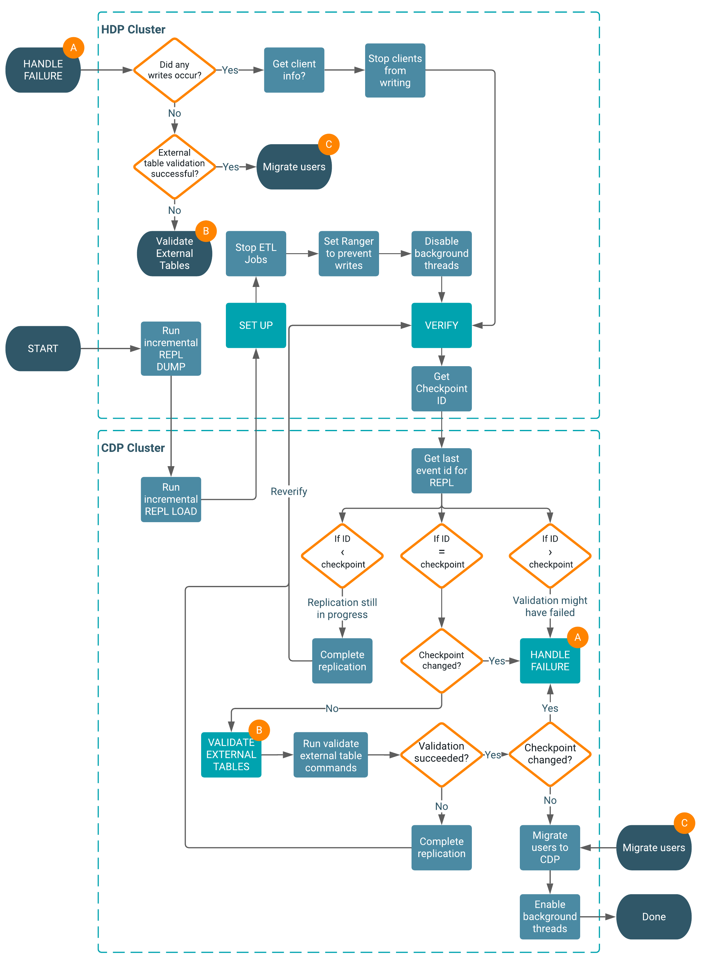 After replicating Hive databases from HDP 3.1.5 (with patches) to CDP 7.1.6 (with patches) you need to verify that the replication succeeded. After verification that databases on both clusters are in sync, you can stop running workloads on the HDP cluster and restart workloads on the CDP cluster.