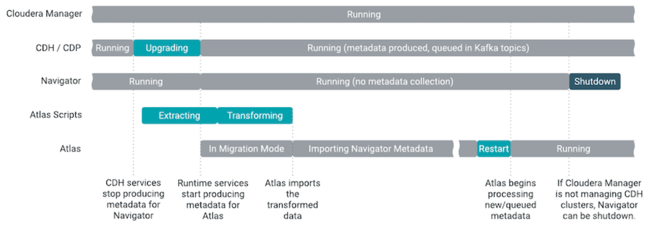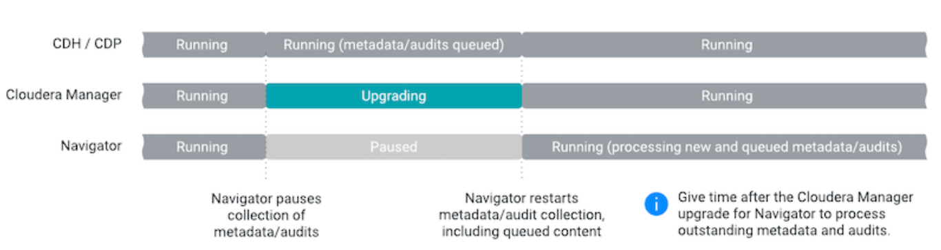 To make sure you do not miss metadata for cluster operations, provide time after the Cloudera Manager upgrade and before the CDH upgrade for Navigator, to
