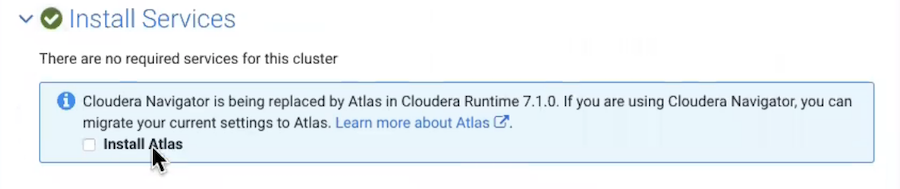 If the cluster being upgraded was running Navigator, the upgrade wizard shows a note recommending that you enable Atlas in the new cluster. Check the Install Atlas option.