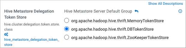 • If you have a cluster secured by Kerberos, search for Hive Delegation Token Store, which specifies storage for the Kerberos token as described below.