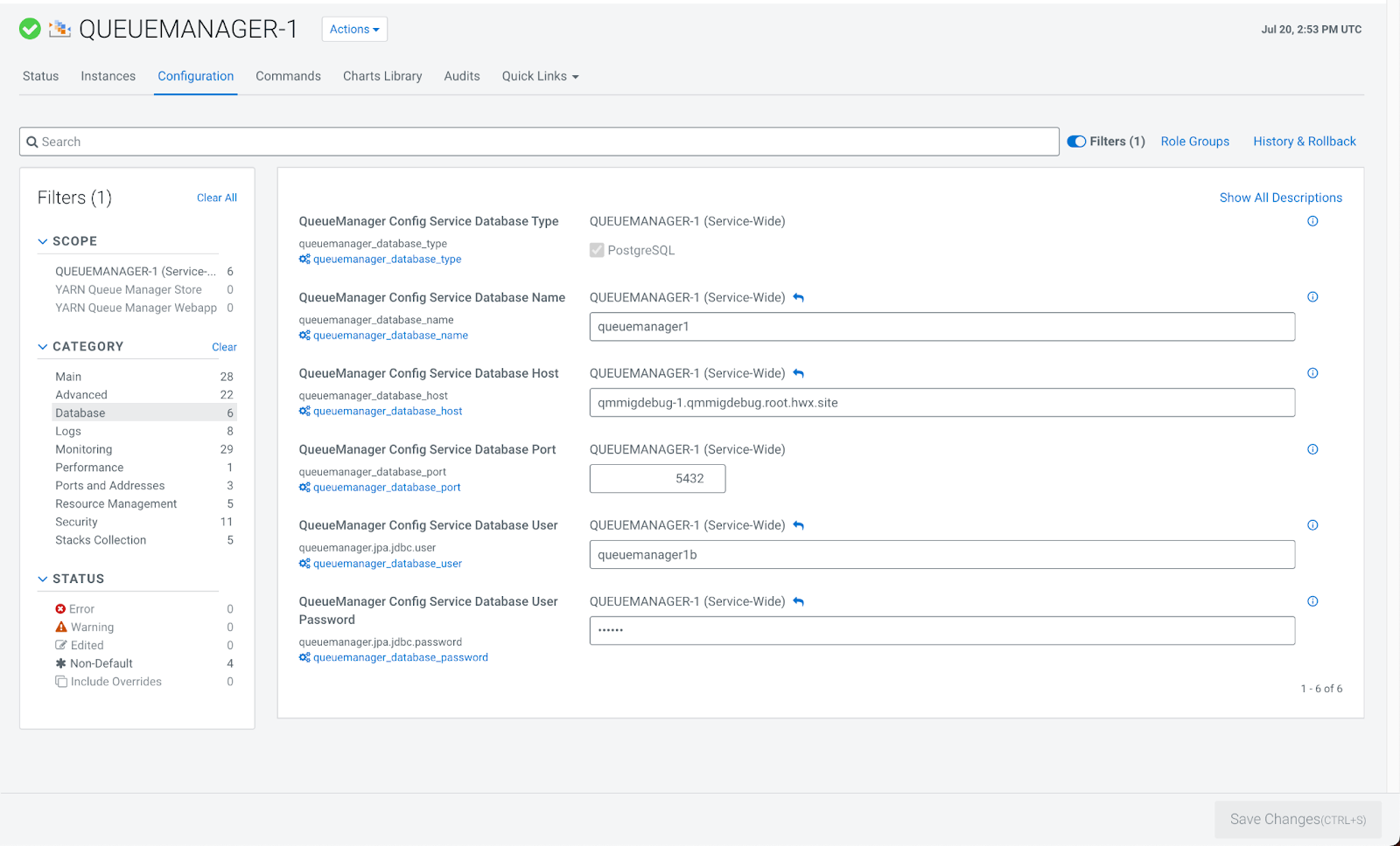 - In Queue Manager, navigate to Actions and click Restart. The data migration to the PostgreSQLdata database may take a few minutes after Queue Manager is restarted.
