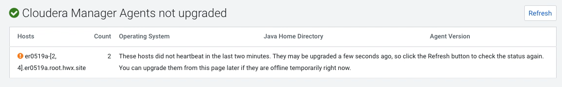 The Upgrade Cloudera Manager page displays the status of the upgrade. If you see a message listing Cloudera Manager Agents not upgraded, wait a few minutes for the agents to heartbeat and the click the Refresh button.