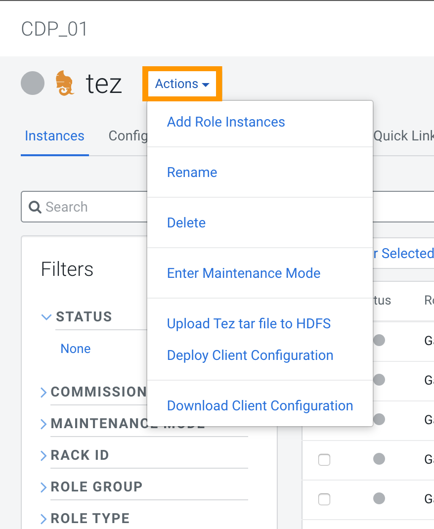 Tez Install the Tez tar files on HDFS. From the Tez cluster service, install Tez tar files on HDFS used by Hive use and then deploy Client Configuration.Run Upload Tez tar file to HDFS Deploy Client Configuration. Parent topic: Post transition steps