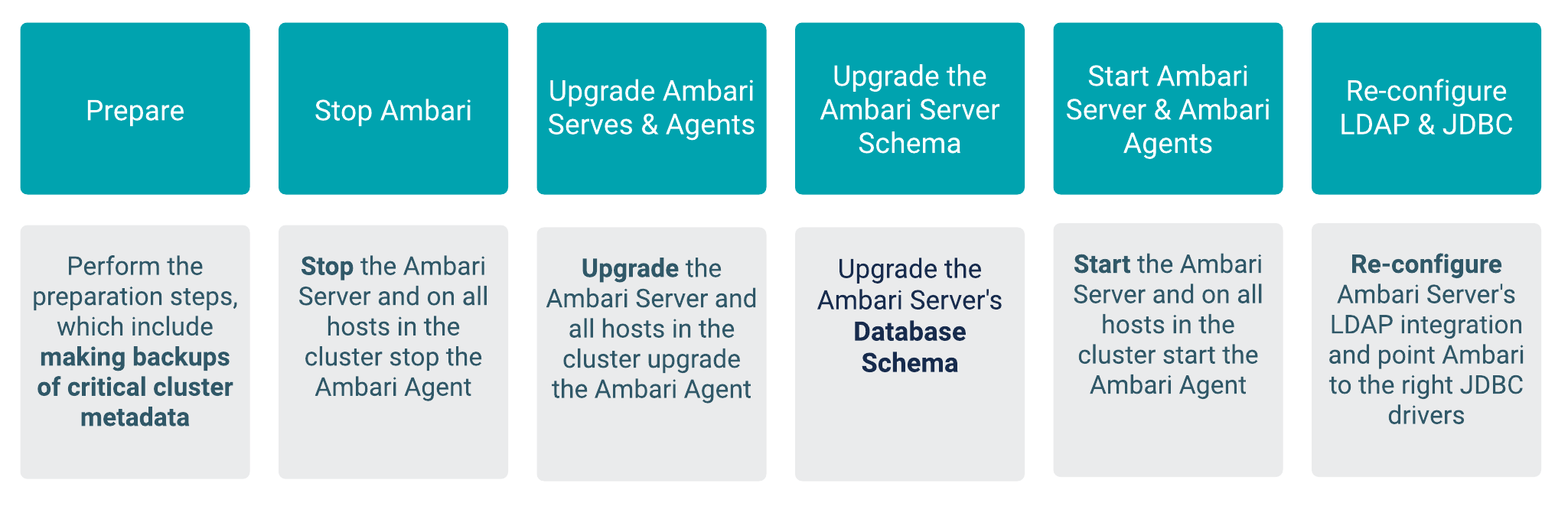 You must be aware of the exact steps and understand the interdependencies and order of the steps so that you can adjust and account for any special configurations for your cluster before starting the Ambari upgrade process.