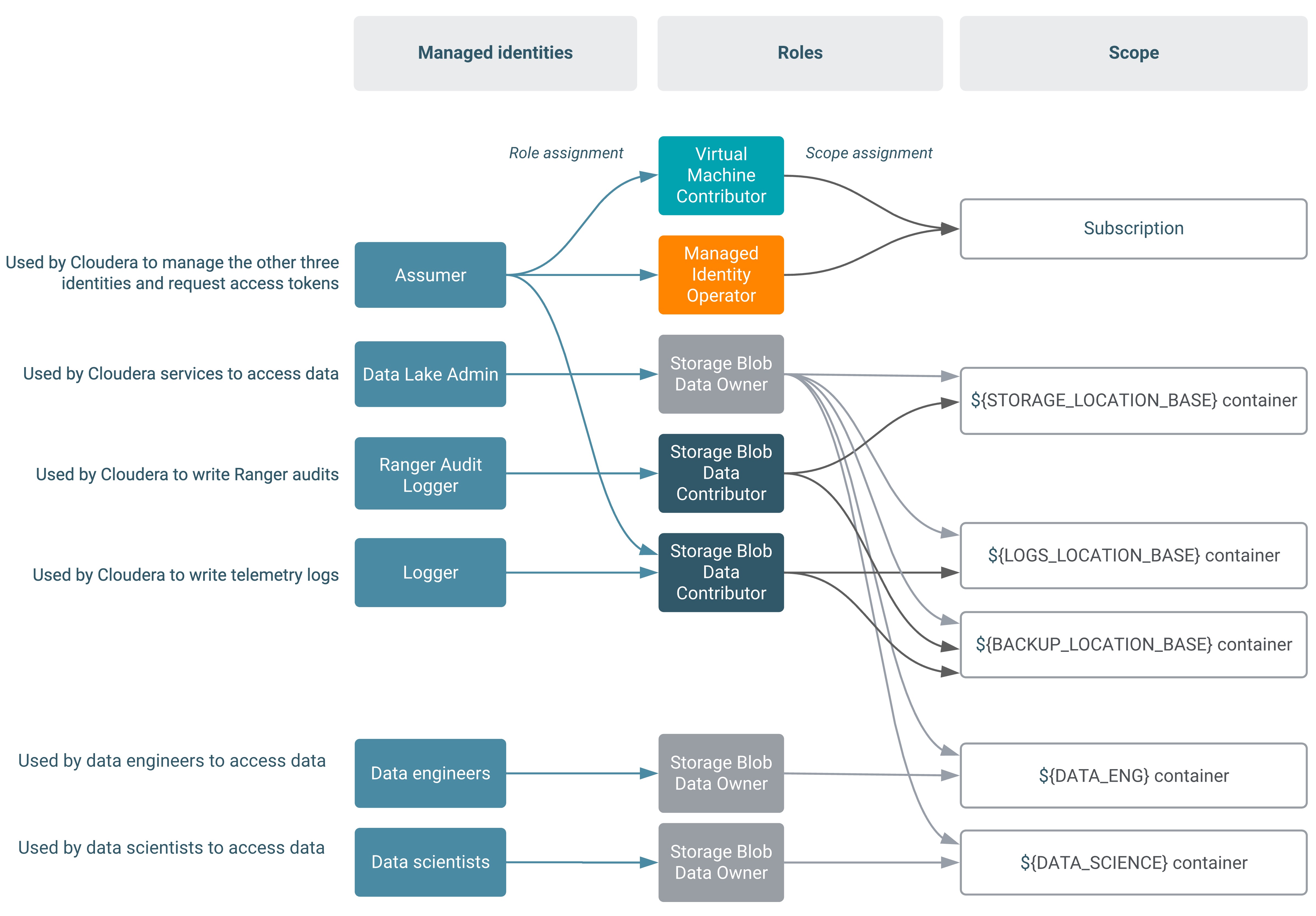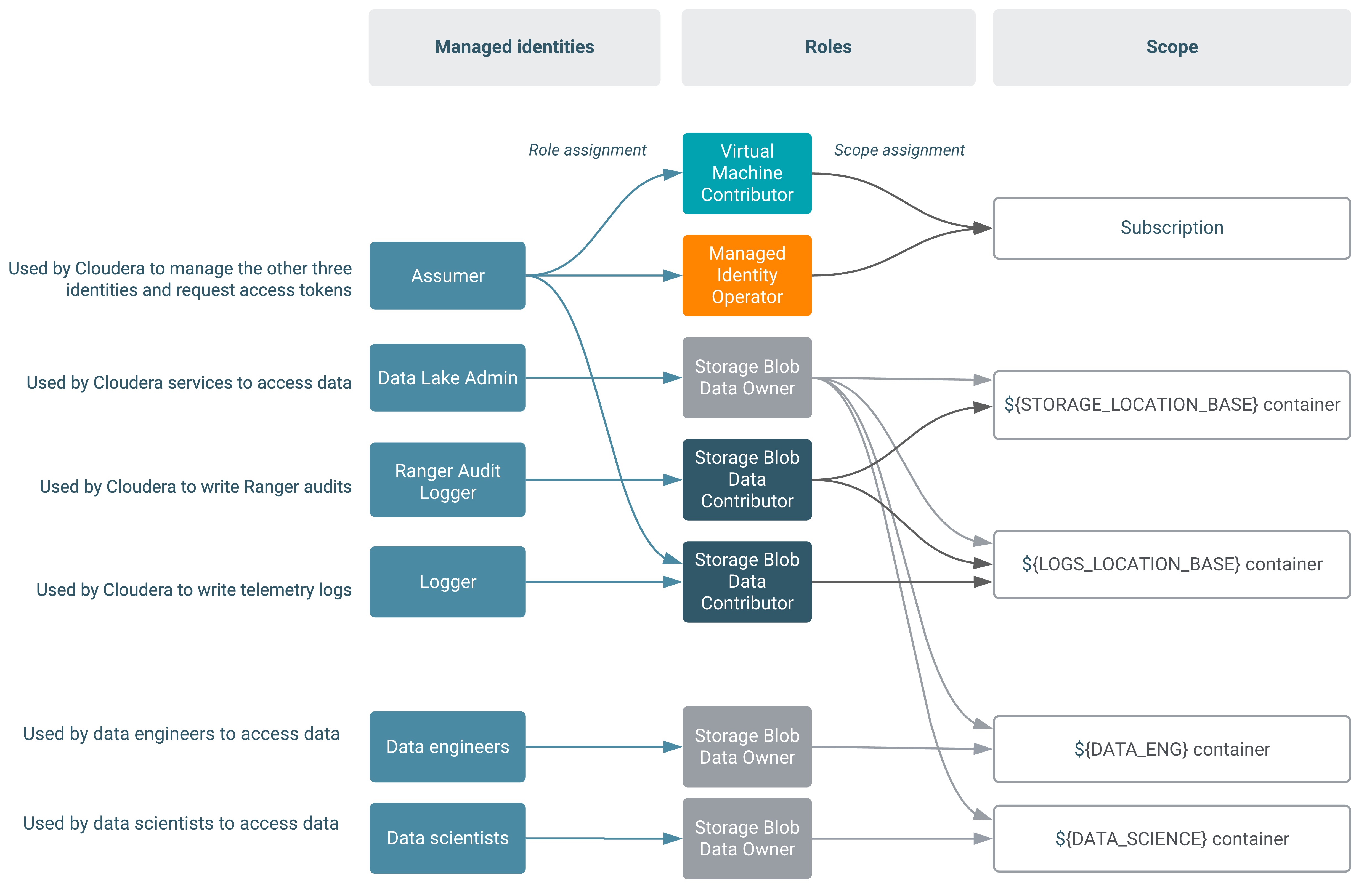 The minimal setup defined earlier spins up a Cloudera environment and Data Lake with no end user access to cloud storage. Adding users and groups to a Cloudera environment involves ensuring that they are properly mapped to managed identities to access cloud storage.