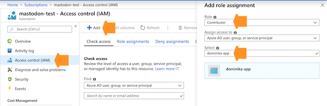Click Add > Add role assignment and then assign the Contributor role or the custom role to your newly created application by: