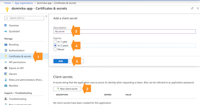 Next, navigate to Certificates & secrets and generate a new secret by clicking + New client secret, providing a description and expiration time, and clicking Add: