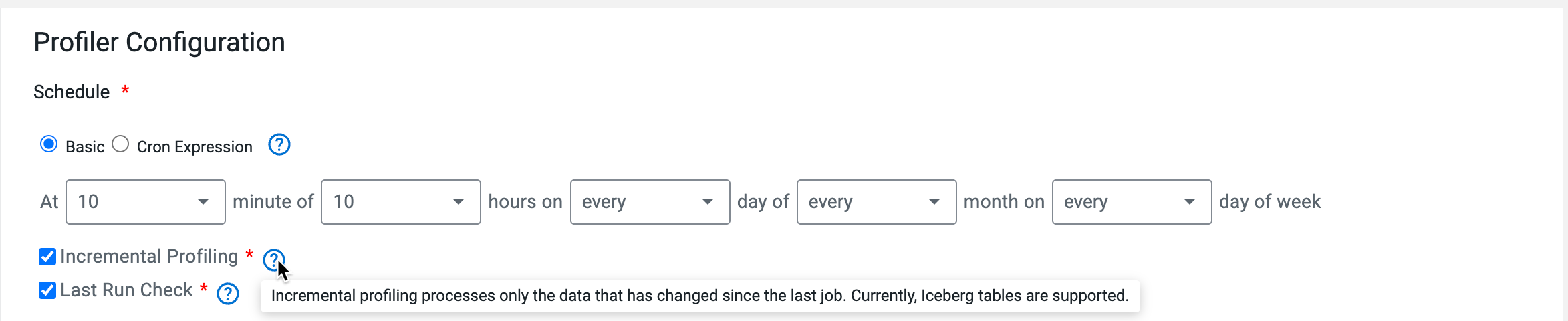 Using Incremental Profiling can decrease the compute resources and the time needed for the profiling job by processing only the information (only Iceberg tables) updated or added since previous job.