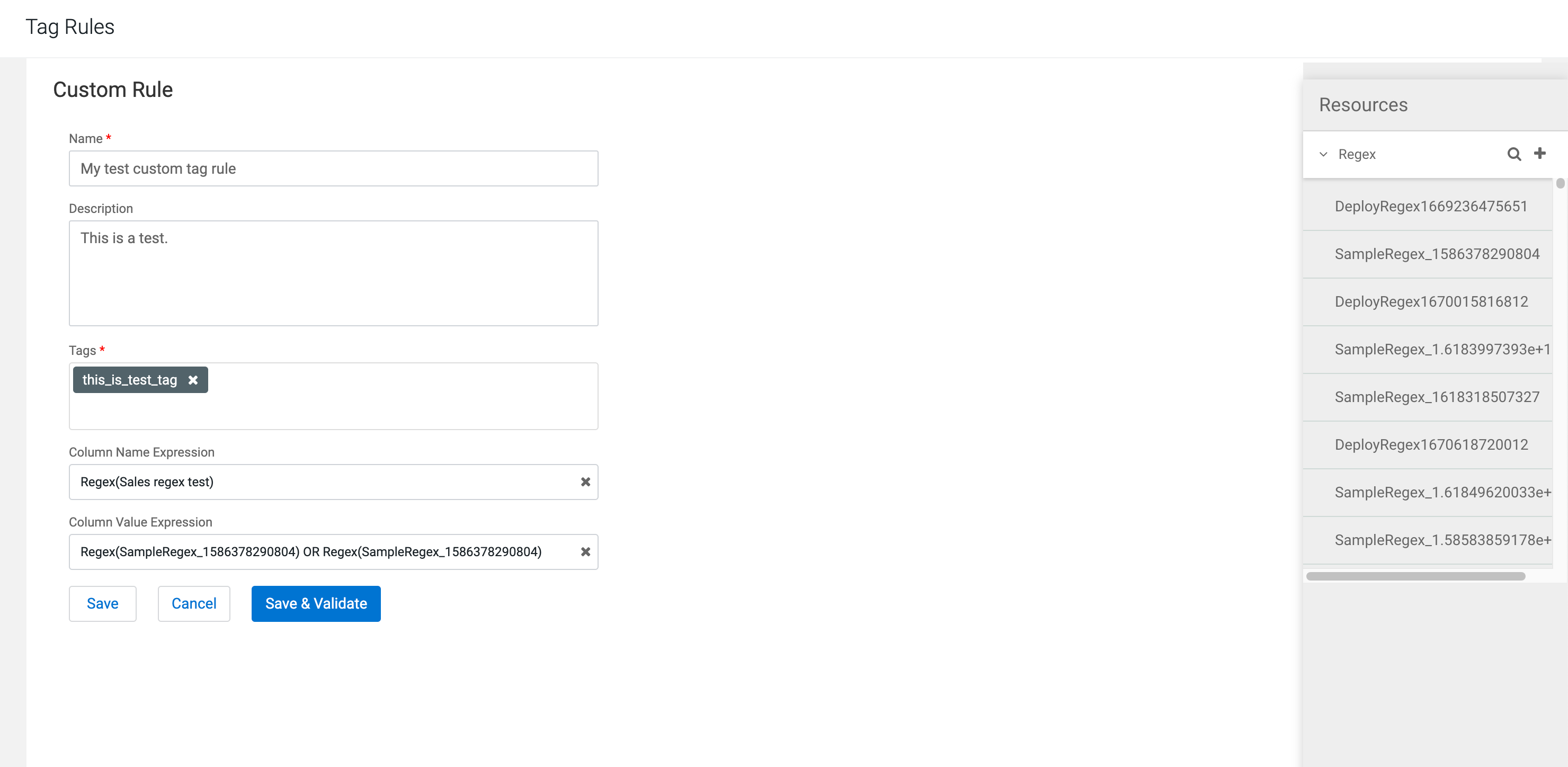 The status for the newly created regular expression validation is displayed on the Tags Rules tab. Once the validation is successful, you can deploy the rule.