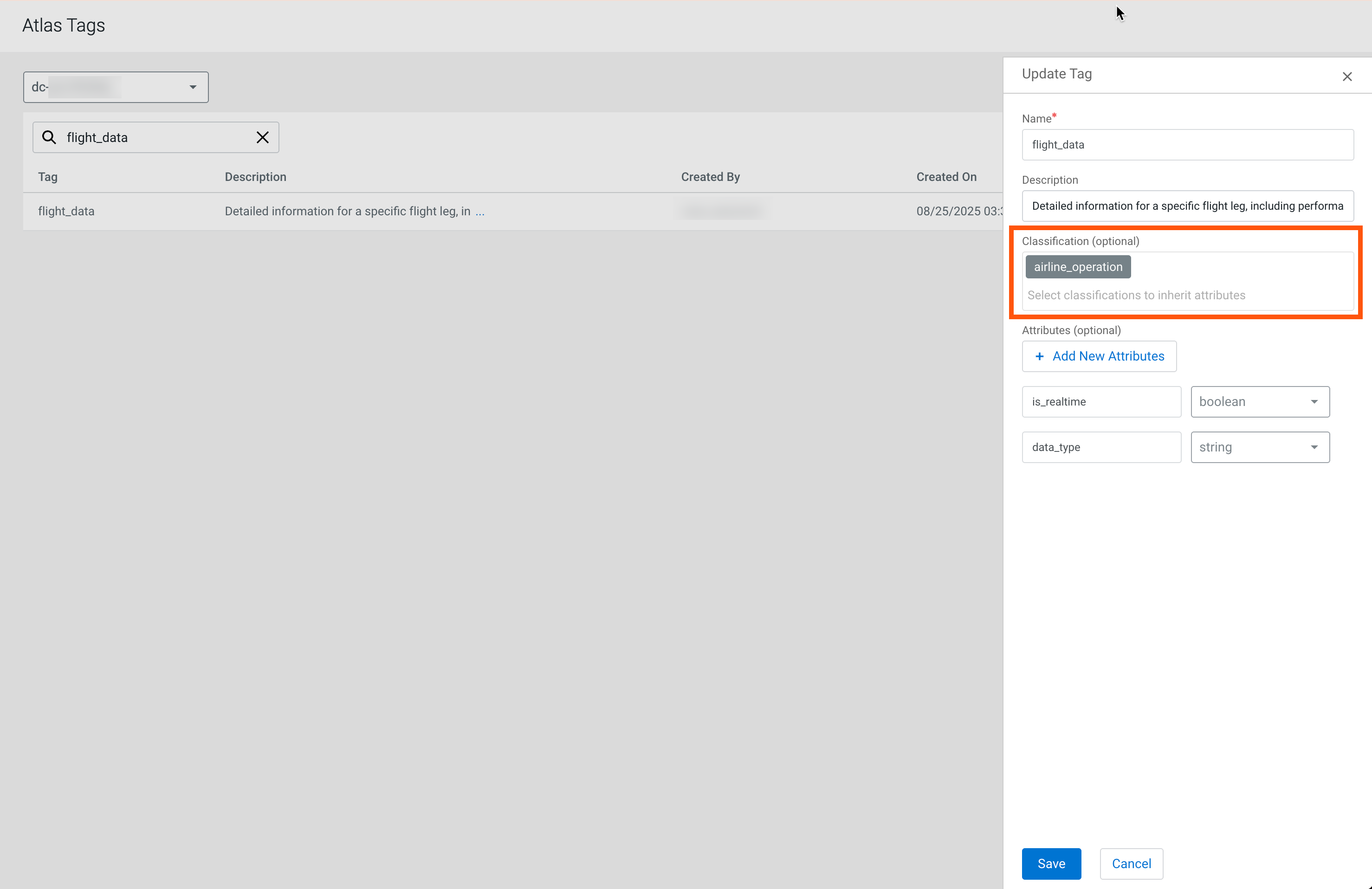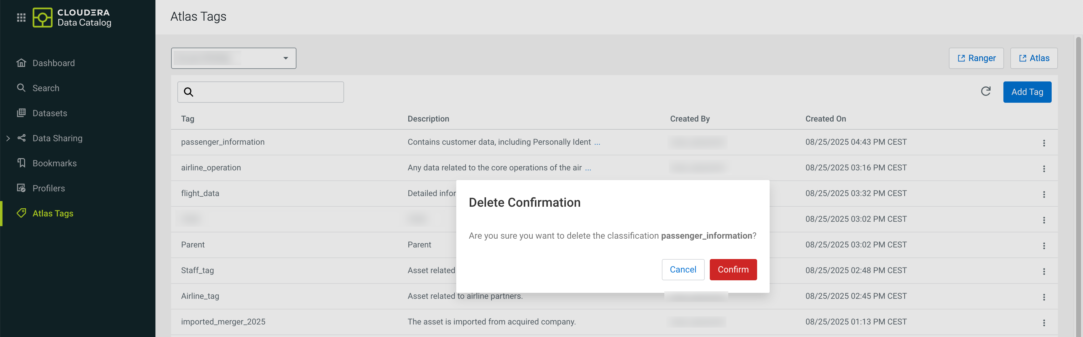 From the Atlas Tags menu, you can create, modify, and delete any of the Apache Atlas classifications to help data discovery and applying governance policies such as security and access control in Apache Ranger.