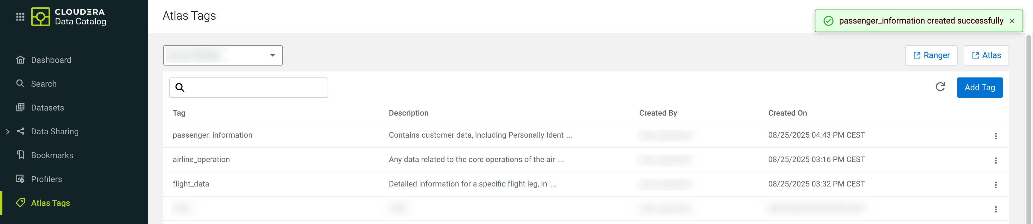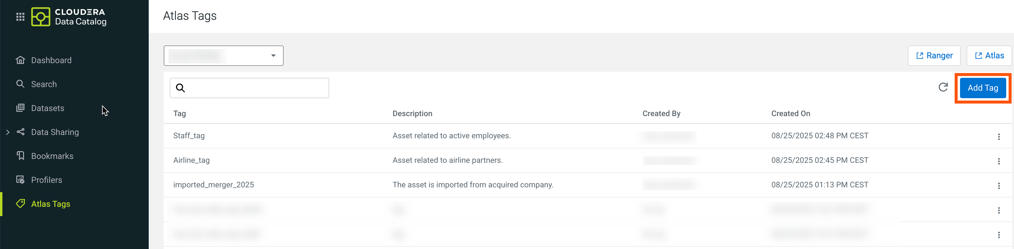 You can create a new Cloudera Data Catalog tag in the Atlas Tags, which are synced to Atlas. Click Add Tag to open the Create a new tag page.
