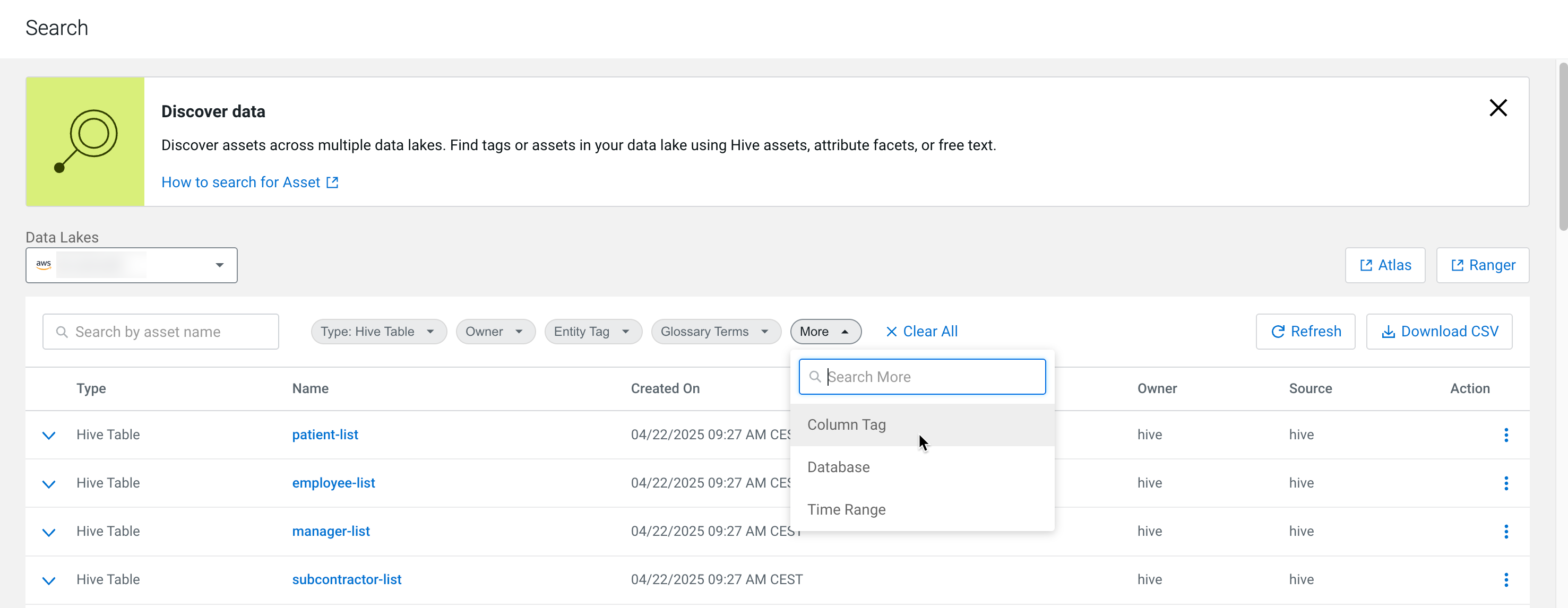 Use the search filter to fine-tune your results. By selecting a type, additional filter options become available and irrelevant filters are hidden. For example, after selecting Hive Table, the Column Tag, Database and Time Range filters are show under More.