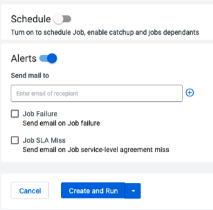 - If you provided a schedule, click Schedule to create the job. If you did not specify a schedule, and you do not want the job to run immediately, click the drop-down arrow on Create and Run and select Create. Otherwise, click Create and Run to run the job immediately.