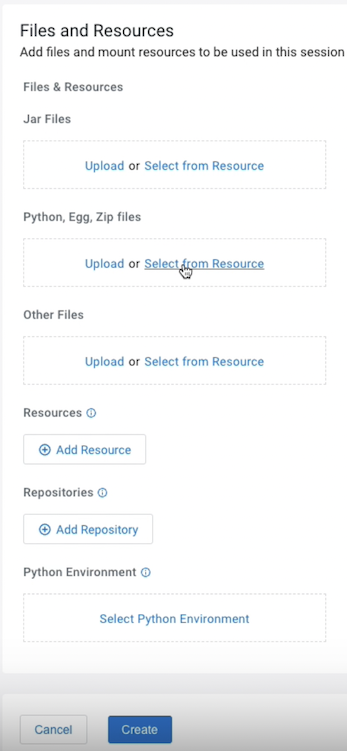 Optional: Under Files and Resources, you can upload Jar, Python, Egg, Zip,