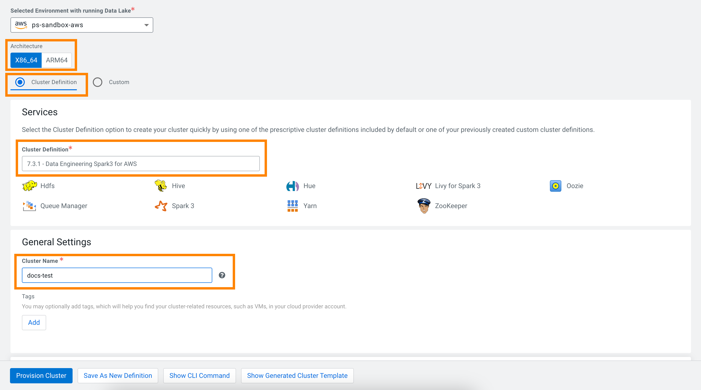 click on an environment where you would like to create a cluster > click Create Data Hub. The following page is displayed: