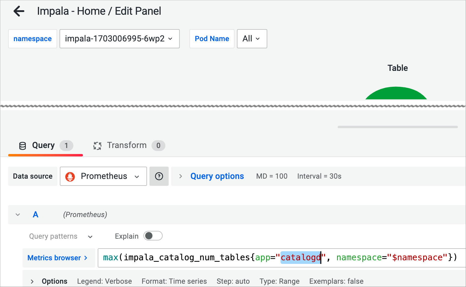 - Catalog metrics for metadata loading have been added to Impala. Getting the fix requires a new environment activation using 1.8.2-b221 Dec 19, 2023 and Impala Virtual Warehouse with 2023.0.16.2-1 (Dec 19, 2023). If activating a new environment is not an option, then you can manually update Grafana charts with database and table counts to make the following change to the Prometheus query: