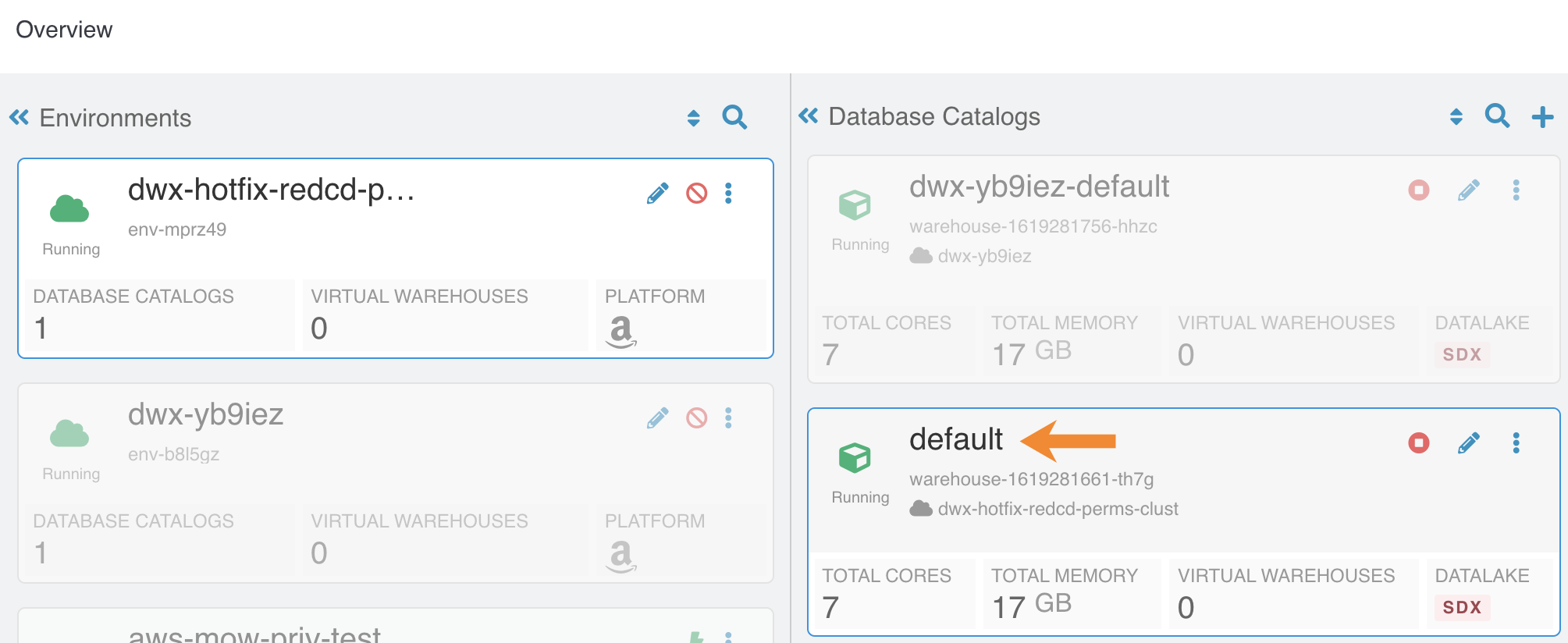 This does not cause collisions because each Database Catalog named "default" is associated with a different environment. For more information about reduced permissions mode, see Reduced permissions mode for AWS environments.