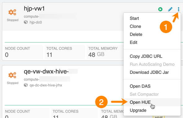You can now access Hue to query Hive Virtual Warehouses from the Virtual Warehouse tile: