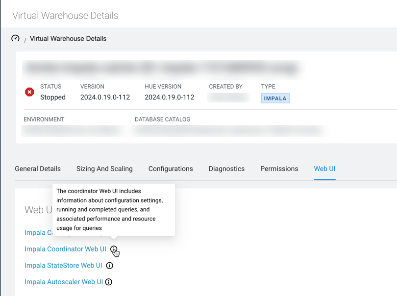 6. Go to Cloudera Data Warehouse > Overview > Impala Virtual Warehouse > > Edit > Web UI, and then click each Impala Coordinator Web UI n link to get information about the coordinator.