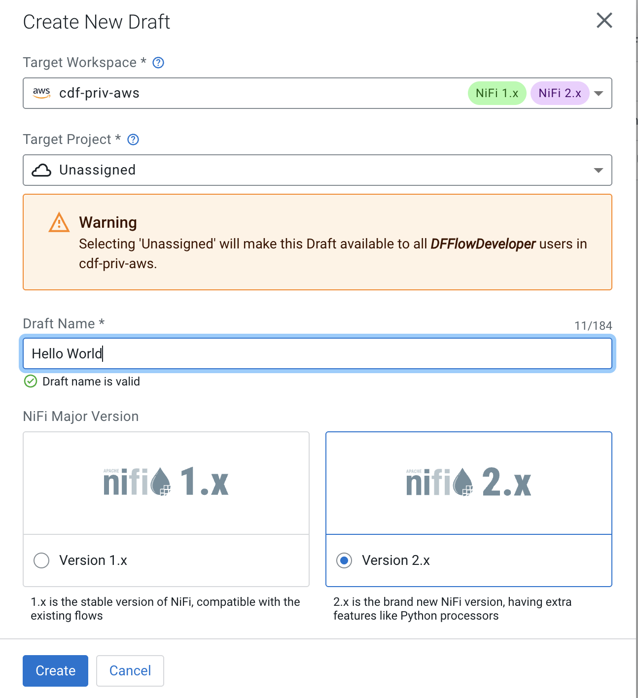 - Select the Version 2.x radio card for the NiFi Major Version field.