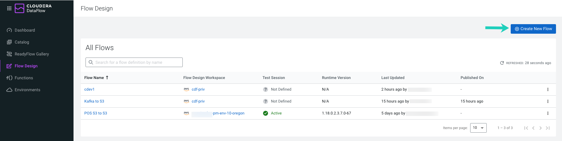 You are redirected to the Flow Design page, where previously created draft flows are displayed, one flow per row.