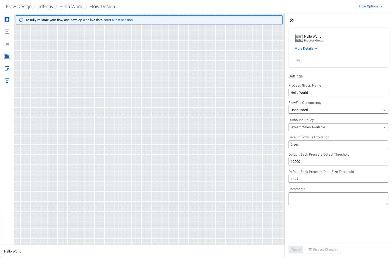 Flow Designer creates a default Process Group with the Draft Name you provided, Hello World in this case, and you are redirected to the Flow Design canvas. The Configuration pane on the right displays configuration options for the default Process Group.
